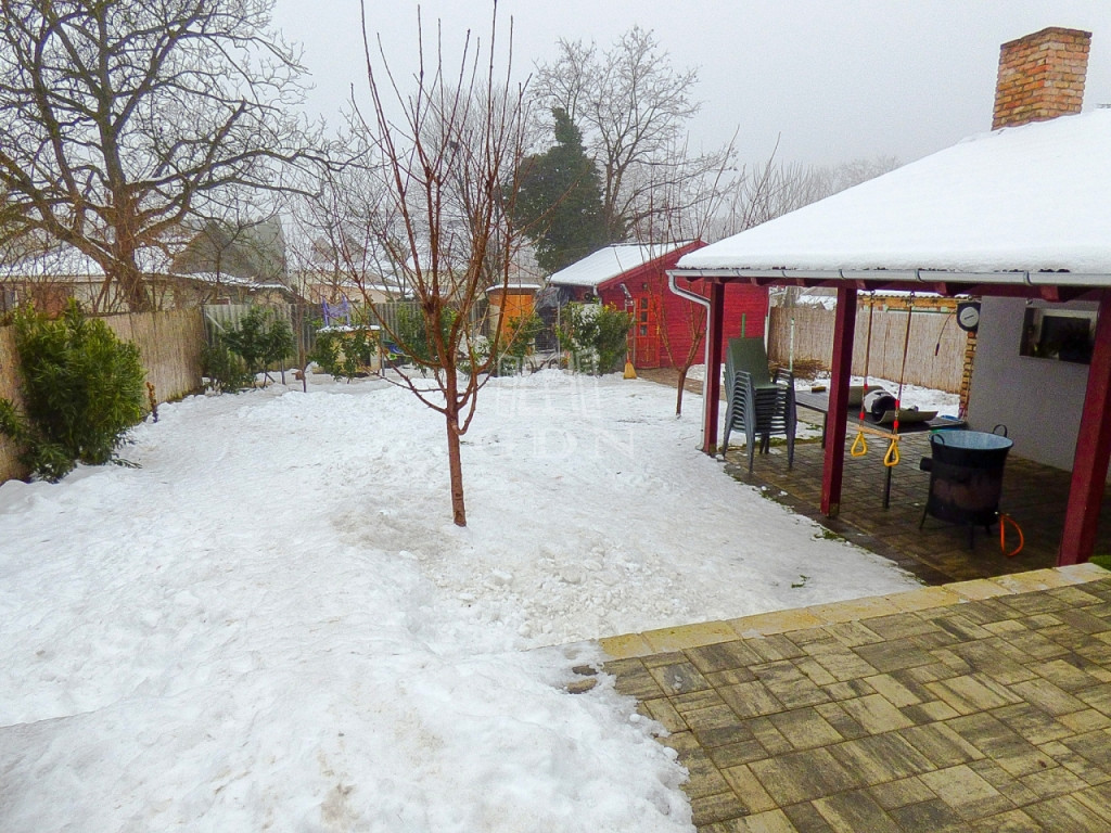 A kert rendezett, karbantartott, gyönyörű babérmeggy sorral körbekerített, ezzel is biztosítva az intim szférát. A hátsó rész alkalmas kikapcsolódásra, pihenésre, az oldalsó részen automata kapun keresztül megközelíthető felszíni gépkocsi beálló (akár 5 autó számára) kapott helyet, továbbá ásott - gyűrűs kút, öntöző rendszer, robot fűnyíró és a kert végében lévő 45 nm-es szigetelt tároló áll az új tulajdonosok rendelkezésére.