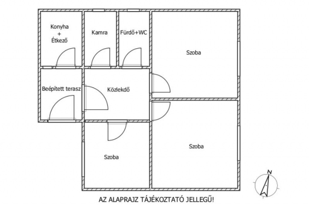 A házba a beépített teraszon keresztül lépünk be, ahonnan az étkezős konyha és egy tágas közlekedő nyílik. Innen minden helyiség külön megközelíthető: három szoba, egy zuhanyzós fürdő WC-vel, valamint egy kamra, ahonnan a padlás is elérhető.
