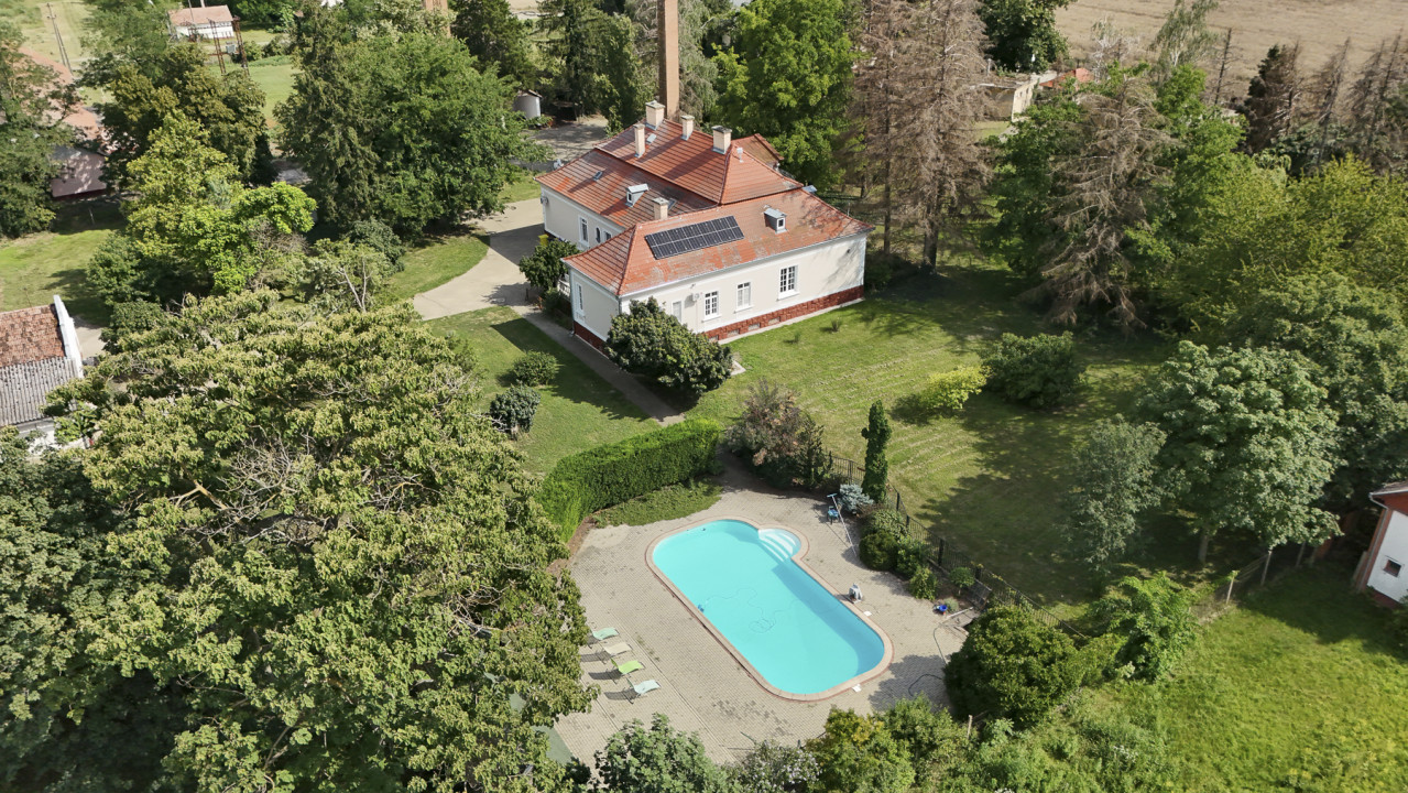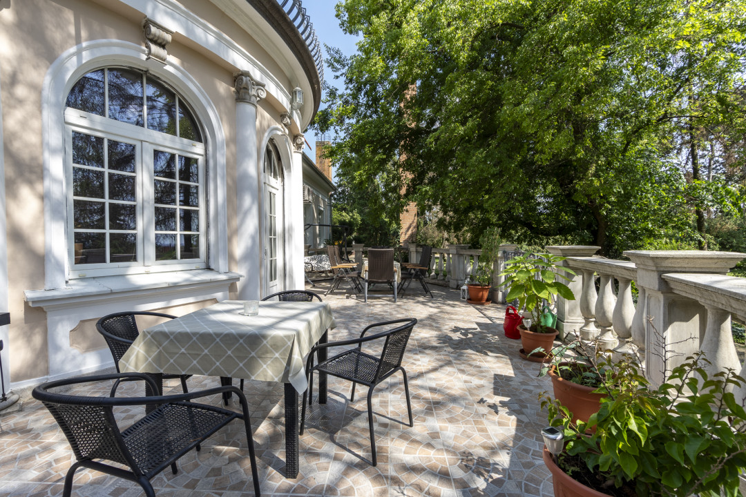 Az épület egyik külső falát egy Mária ikon díszíti, amelyet 2004-ben műemléki tárggyá nyilvánítottak. Ha távolabbról szemléljük az ingatlant, figyelmesek lehetünk a manzárd típusú tetőszerkezetre. Kicsit távolodva érzékelhetővé válik a körülbelül 2000 akácfából álló erdő, amely nyugalmat áraszt és megteremti az elrejtőzést lehetőségét a kívülről vágyakozó, kíváncsi szemek elől. Egy kültéri medence is található az udvaron, amely akár szűk körű, akár nagyobb baráti összejövetelek helyszíneként is szolgálhat.
