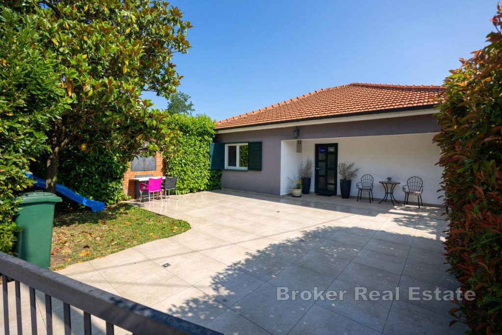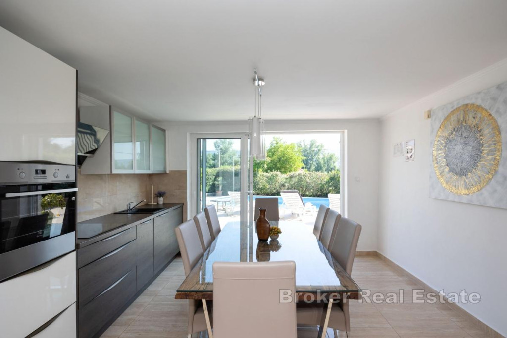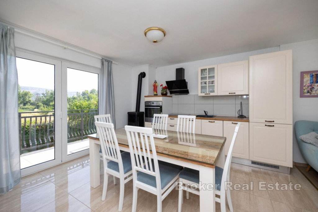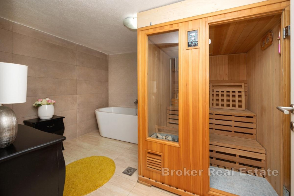 For sale is a house with a swimming pool, located in a peaceful village in the Makarska hinterland. The living area is 218 m², while the plot covers 316 m². The house consists of two residential units and a summer kitchen. On the ground floor there is an apartment with two bedrooms, a kitchen with dining area, a living room, a bathroom, and a relaxation room with a sauna and bathtub. There is also an enclosed summer kitchen with a dining and living area, as well as a storage room. On the first floor there is an apartment with two bedrooms, a kitchen, dining area, living room, bathroom, and a terrace. The property features a 34 m² swimming pool, a fireplace/BBQ area, and several parking spaces. It was completely renovated in 2017 and is suitable for tourism, a holiday home, or family living. BROKER REFERENCE ID:2047/96