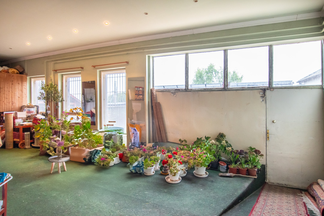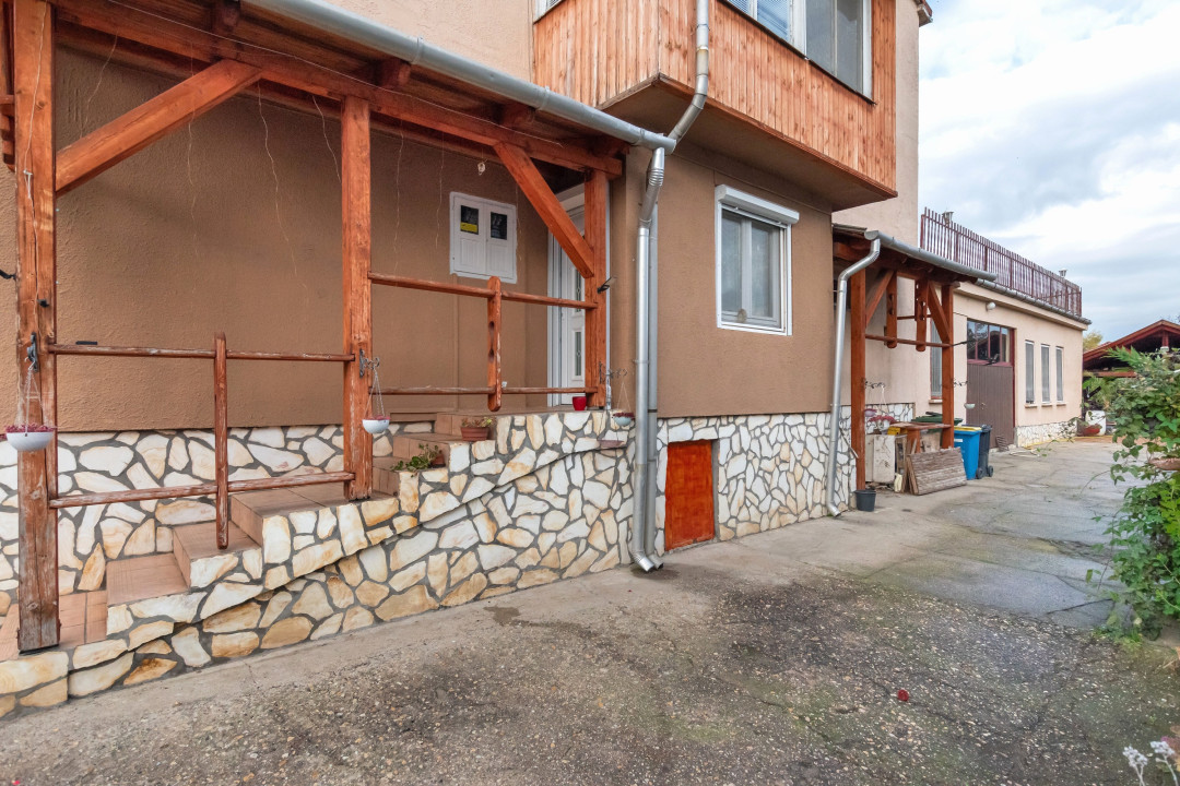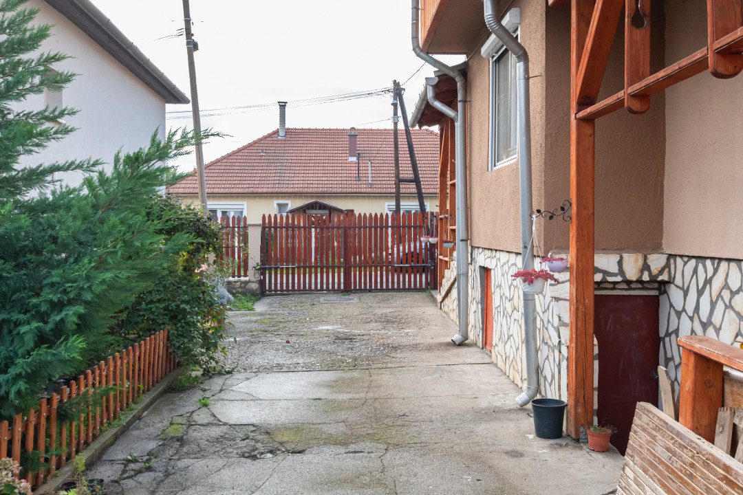 Az udvar részben betonozott, ahol két autó parkolására is kényelmesen használható fedett autóbeálló lett kialakítva, a kert további része gyümölcsfákkal gazdagon telepített. A ház háta mögött egy 60 m²-es fűthető épület található szerelőaknával, beépített szaunával. Tökéletes hely a hobbihoz, kreatív projektekhez vagy akár kisvállalkozás indításához.