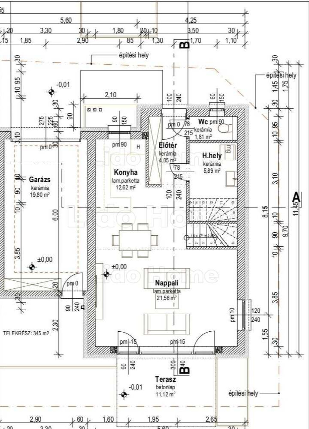 Elosztás: amerikai konyhás nappali + előszoba + WC + háztartási helyiség + kamra + terasz + garázs