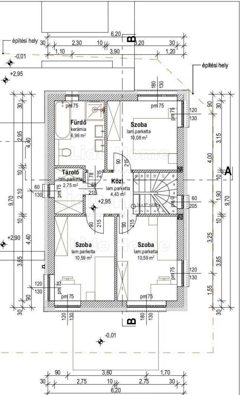 Emelet: 3 szoba + fürdő + közlekedő + gardrób