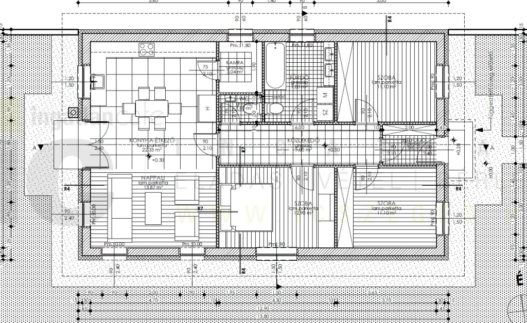 - Egyszintes amerikaikonyhás nappali + 3 szoba, élhető tágat terekkel.