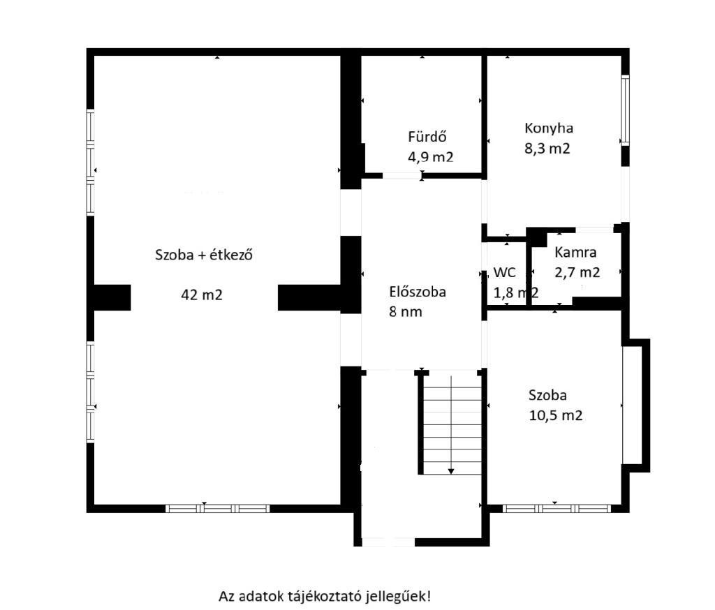 Az ingatlan 5 szobával, konyhával, kamrával, 2 fürdővel és wc-vel rendelkezik.