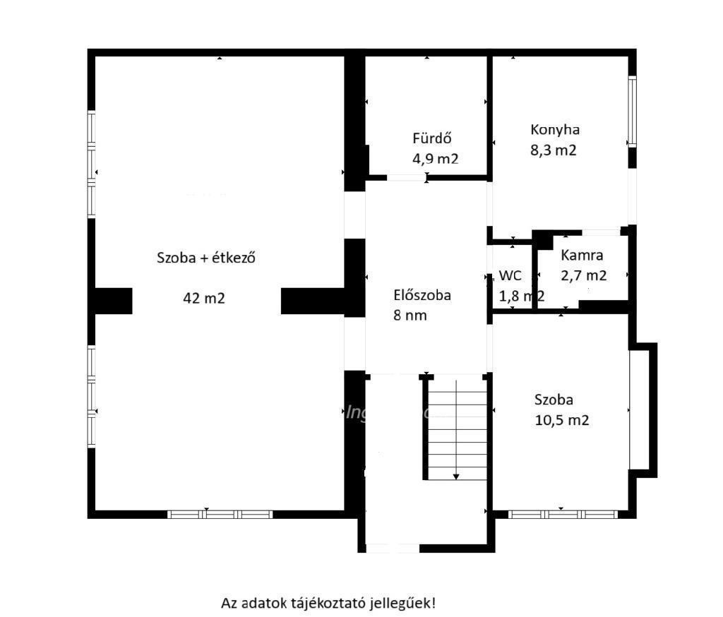 Az ingatlan 5 szobával, konyhával, kamrával, 2 fürdővel és wc-vel rendelkezik.
