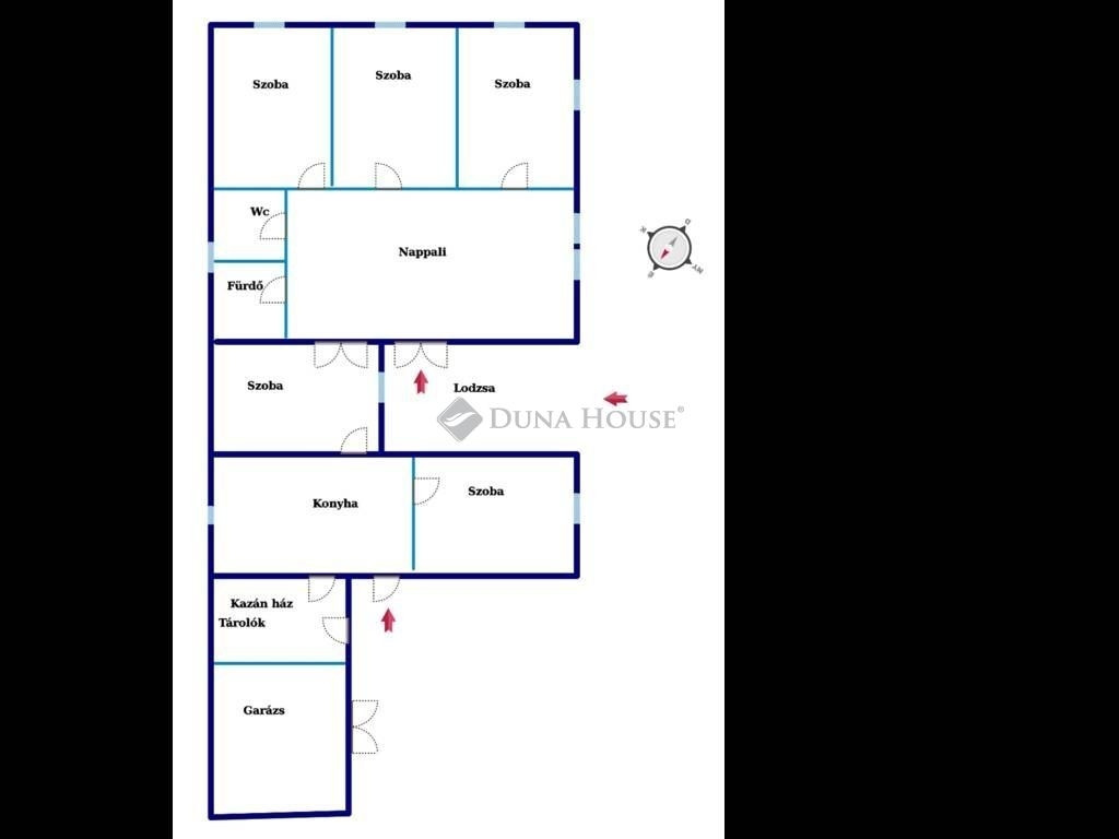 Négy napfényes nagy szoba nagy nappali, konyha, fürdőszoba, wc és több tárolásra alkalmas helyiség.