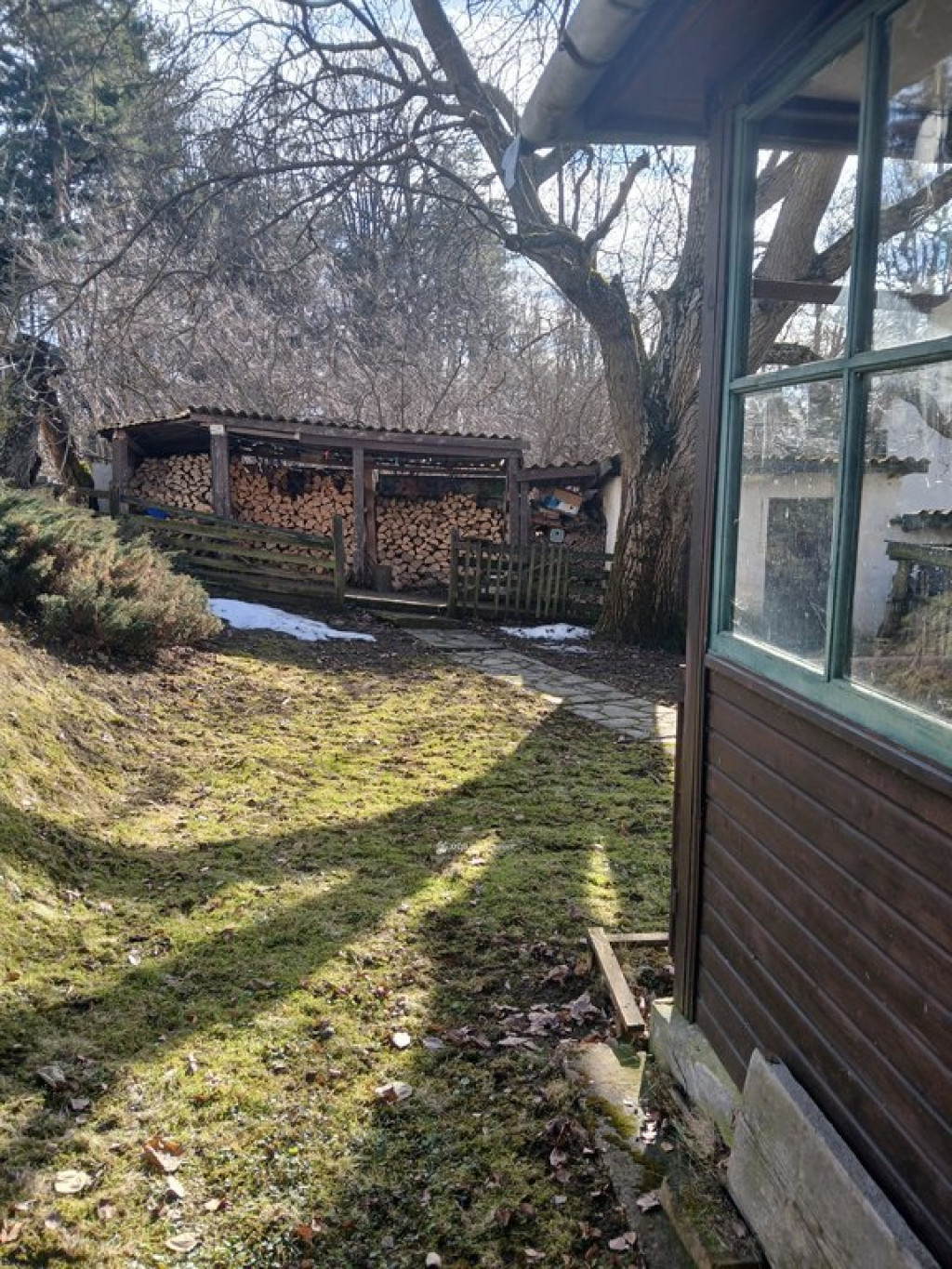 Az előkertben gyümölcsfák találhatók, az épület mögött egy fából készült vendégház, mosdóval zuhanyozóval.