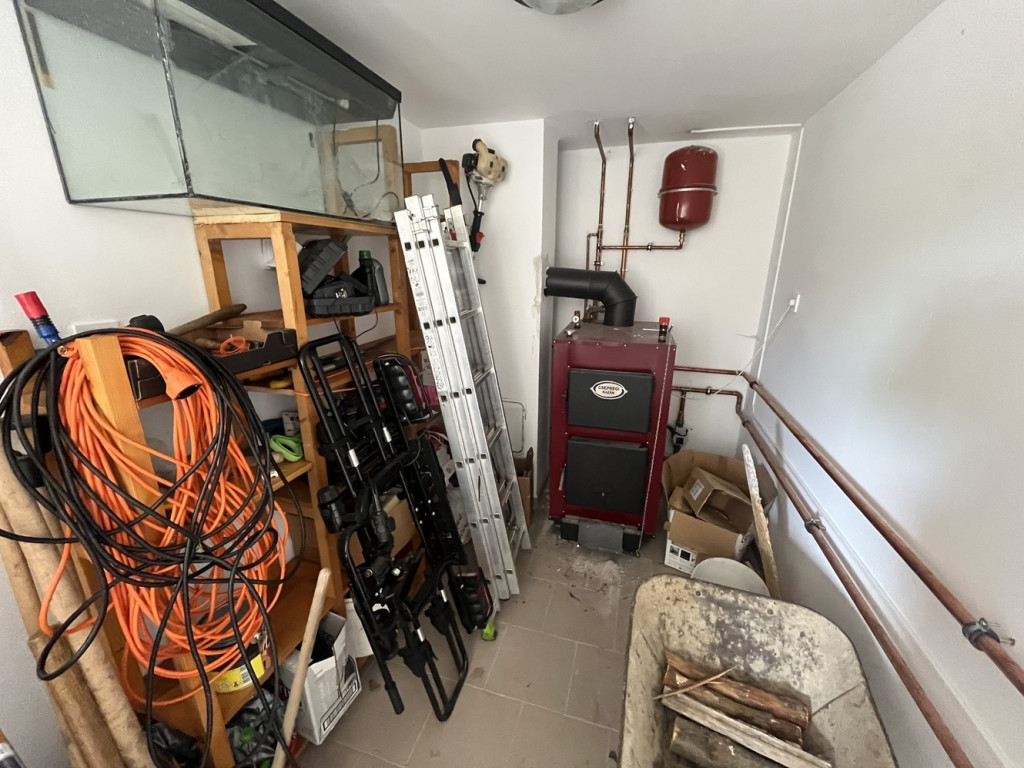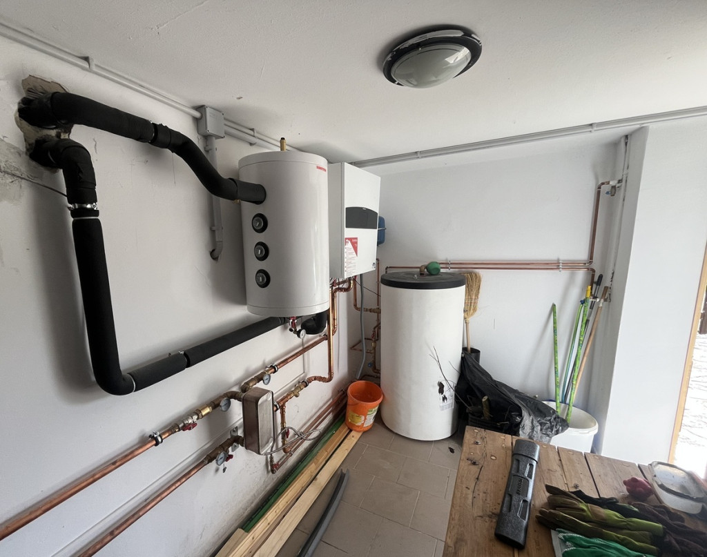 Három féle fűtés van: hőlégszivattyú, fatüzelésű kazán és bobos kemence