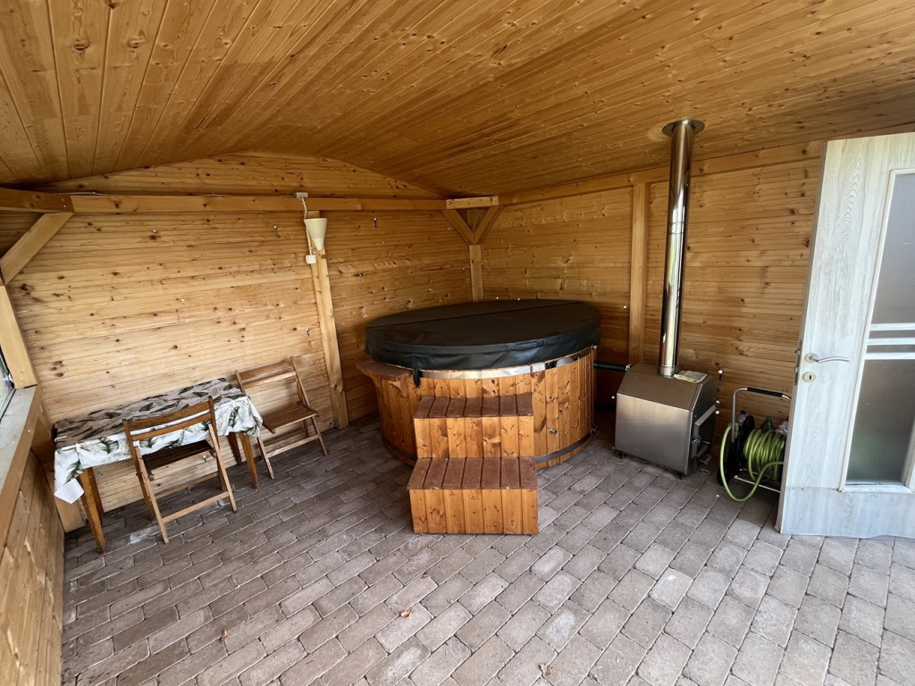 A kert arányos méretű. Az ízlésesen parkosított kertben fatüzelésű merülődésza ház és kerti kis faház épült.