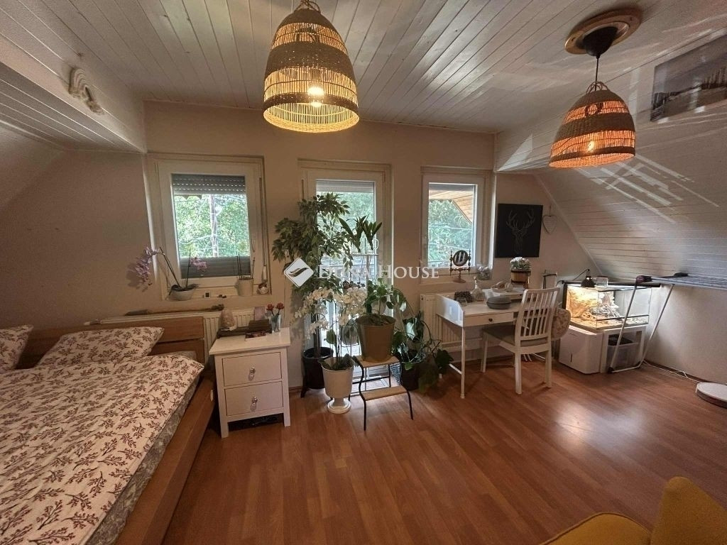 földszinten: tágas nappali, 2 szoba, konyha+étkező, fürdő, 2 külön wc, terasz kiváló kilátással.