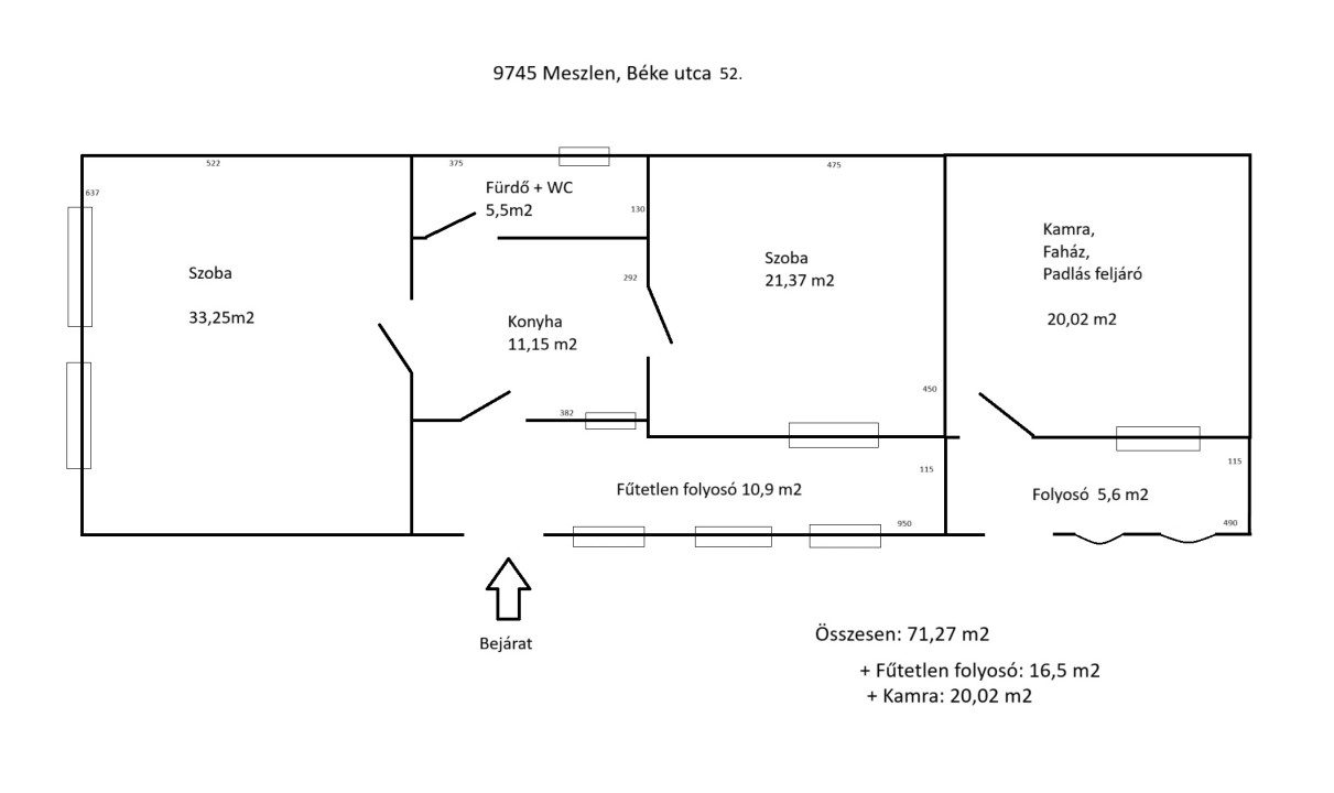 Az ingatlanhoz kapcsolódik még egy 16,5 m2-es fűtetlen folyosó a bejárat előtt, illetve egy fűtetlen 20 m2-es kamra is ahol a padlásfeljáró található. Az ingatlanban található két szoba, konyha és fürdőszoba. A fürdőszobában található a WC.