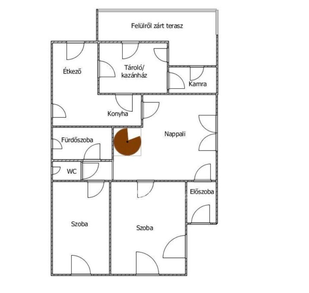 Az ingatlanban 6 szoba (3 az alsó szinten, 3 a felső szinten), előszoba, közlekedő, konyha, étkező, kamra, tároló, fürdőszoba, külön wc, felülről zárt terasz, az emeleten hall, fürdőszoba és WC (egyben) és erkély helyiség található.