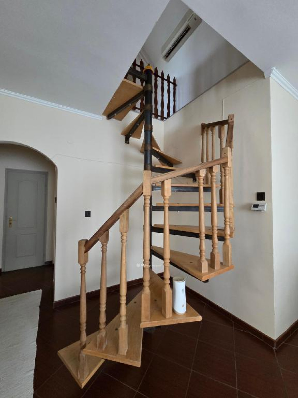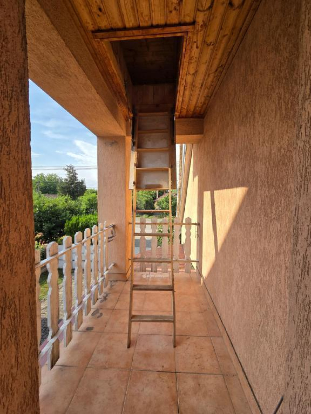 A padlás végig lambériázott és szigetelt. A padlás aljzata is lambéria és alatta pur hab szigetelésű. A cserepek alatt üveggyapot szigetelés van, majd ott is lambéria borítás. A padlásfeljáró az erkélyen található.