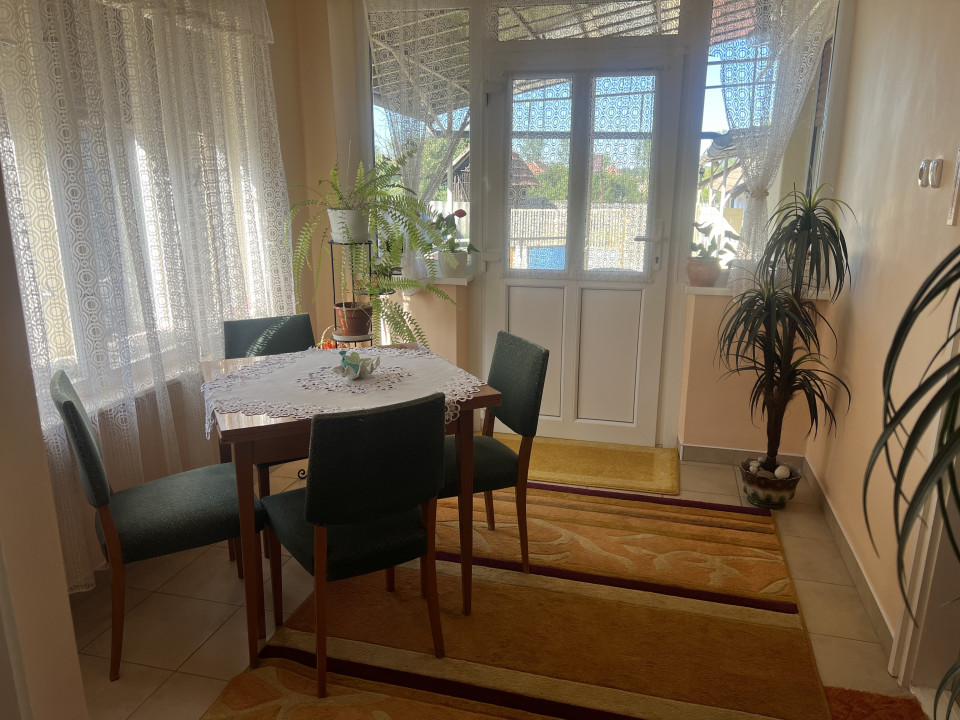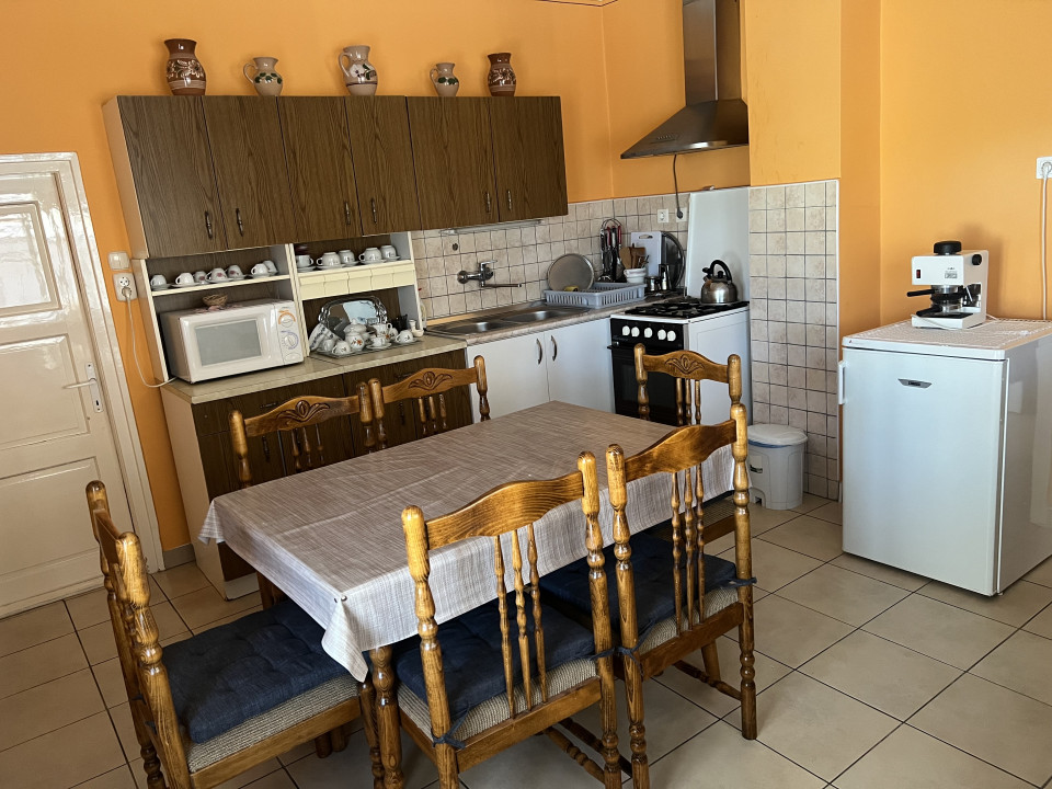 A hátsó bejáratnál jó méretű fedett terasz van, előtte fúrt kút, amiből saját szivattyúval lehet majdnem költségmentesen a vizet használni locsolásra..