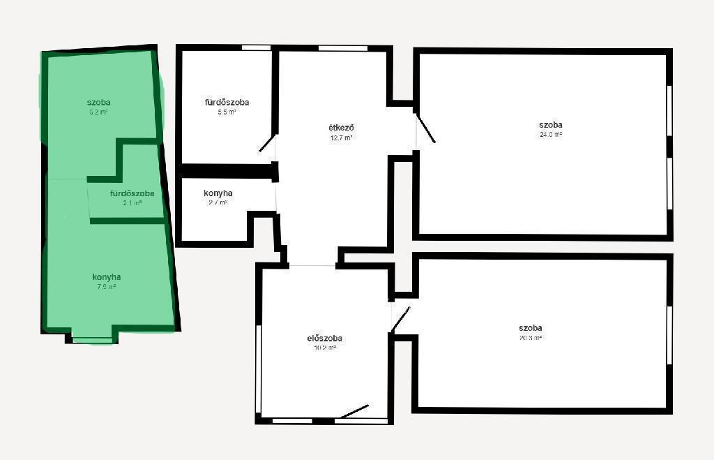Míg a hátsó rész 1 konyhát, 1 szobát és 1 fürdőt rejt magában. Egykor legénylakásként működött.