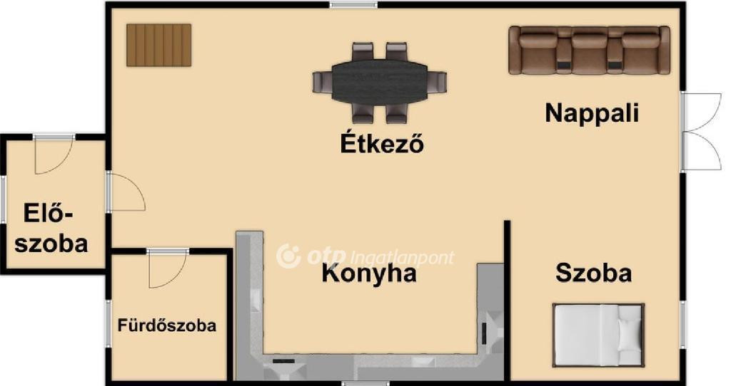Földszint: nappali, szoba, konyha-étkező, fürdőszoba, külön WC, előszoba