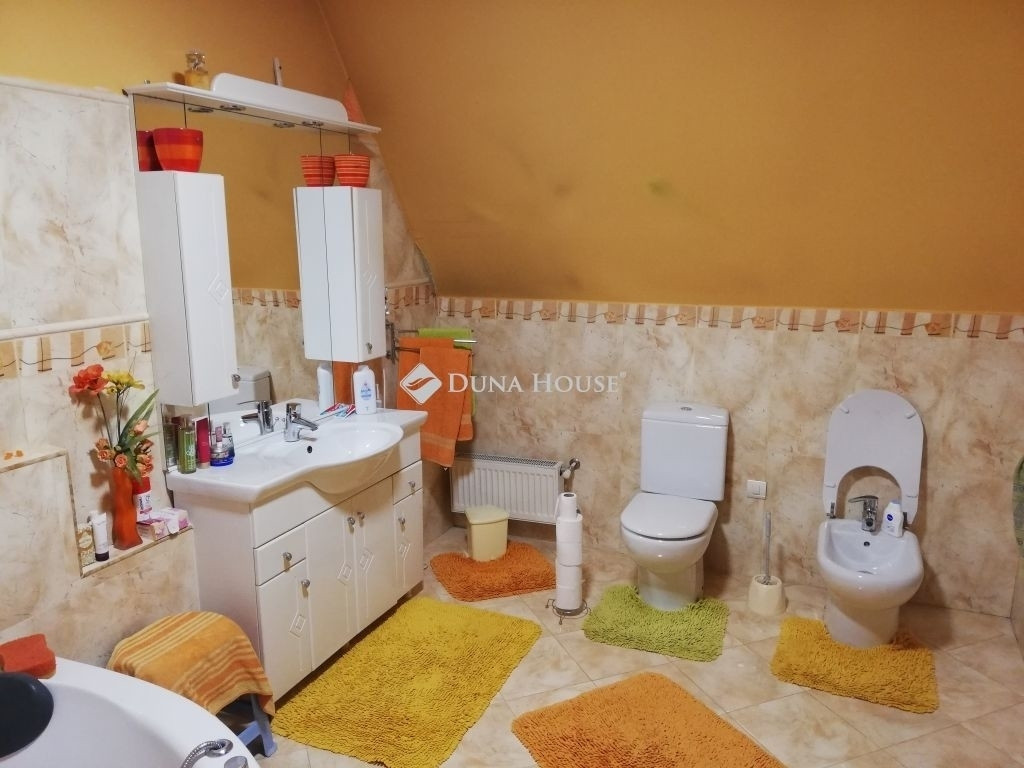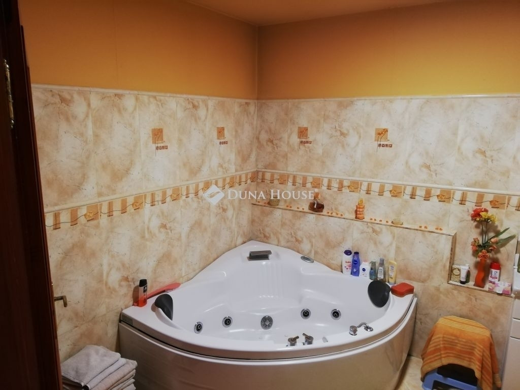 A ház földszintjén előtér, tágas nappali-étkező-konyha, a tetőtérben 3 szoba, fürdő+WC és beépített bútorok találhatók. A fürdőben nagy sarokkád, a melegről új kondenzációs és vegyes tüzelésű kazán gondoskodik radiátorral és padlófűtéssel. 7 db klíma biztosítja a kellemes hőérzetet. Az épület alatt pince is található.