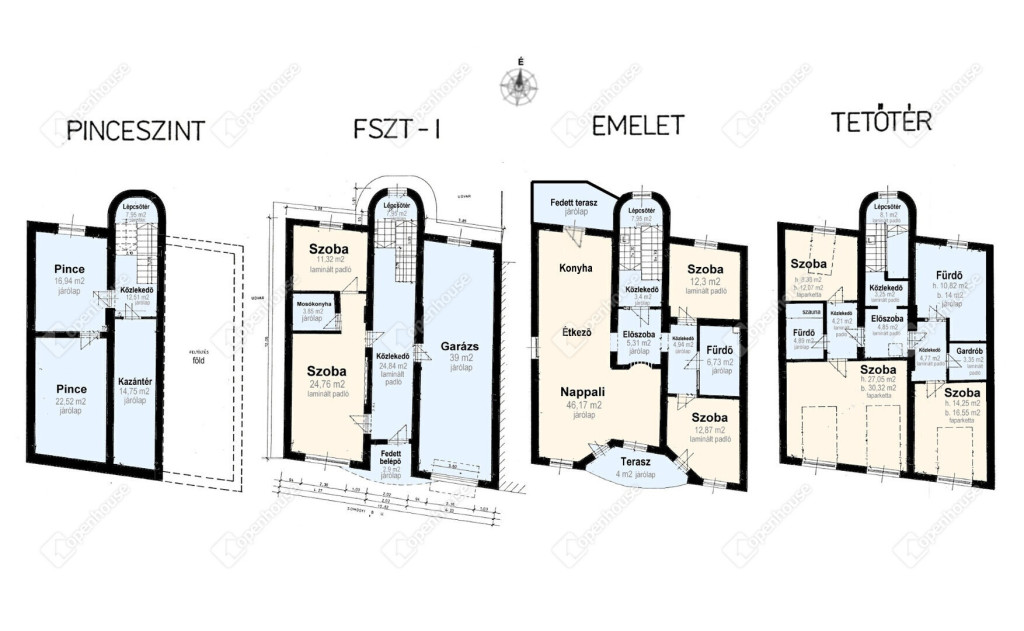 - a szobák laminált és hagyományos faparkettásak, minden egyéb helyiség járólapos