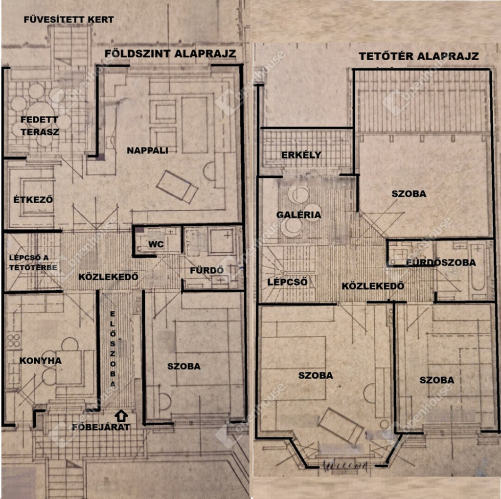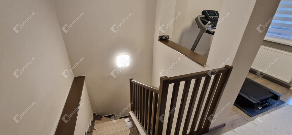 A földszintről egy lépcsőn jutunk fel a tetőtérbe, ahol további három szoba, a közlekedőből (dolgozó sarok, fitness sarok) egy erkély, fürdőszoba és wc áll rendelkezésre.