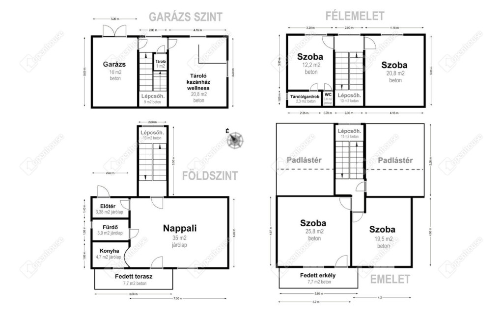 - a nappali, a fedett terasz, az emeleti 8 m2-es erkély és 2 emeleti szoba délnyugati, a 2 félemeleti szoba pedig észak-keleti tájolású