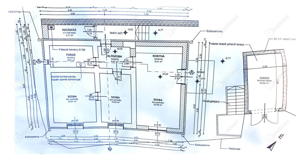 - jó elrendezésű helyiségek, a tervben van egy garázs is tetején fedett terasszal