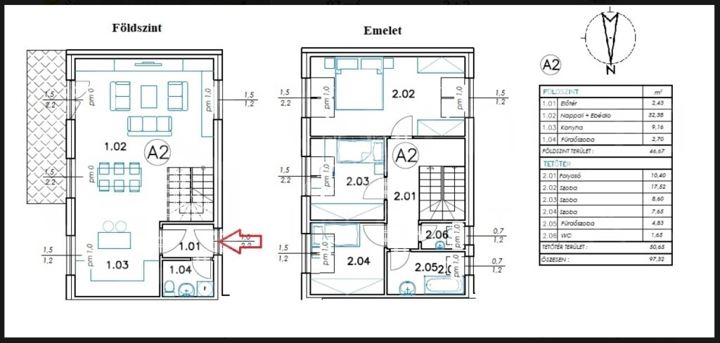 • Földszint: Tágas, napfényes amerikai konyhás nappali étkezővel, valamint egy vendég mosdó-WC.
