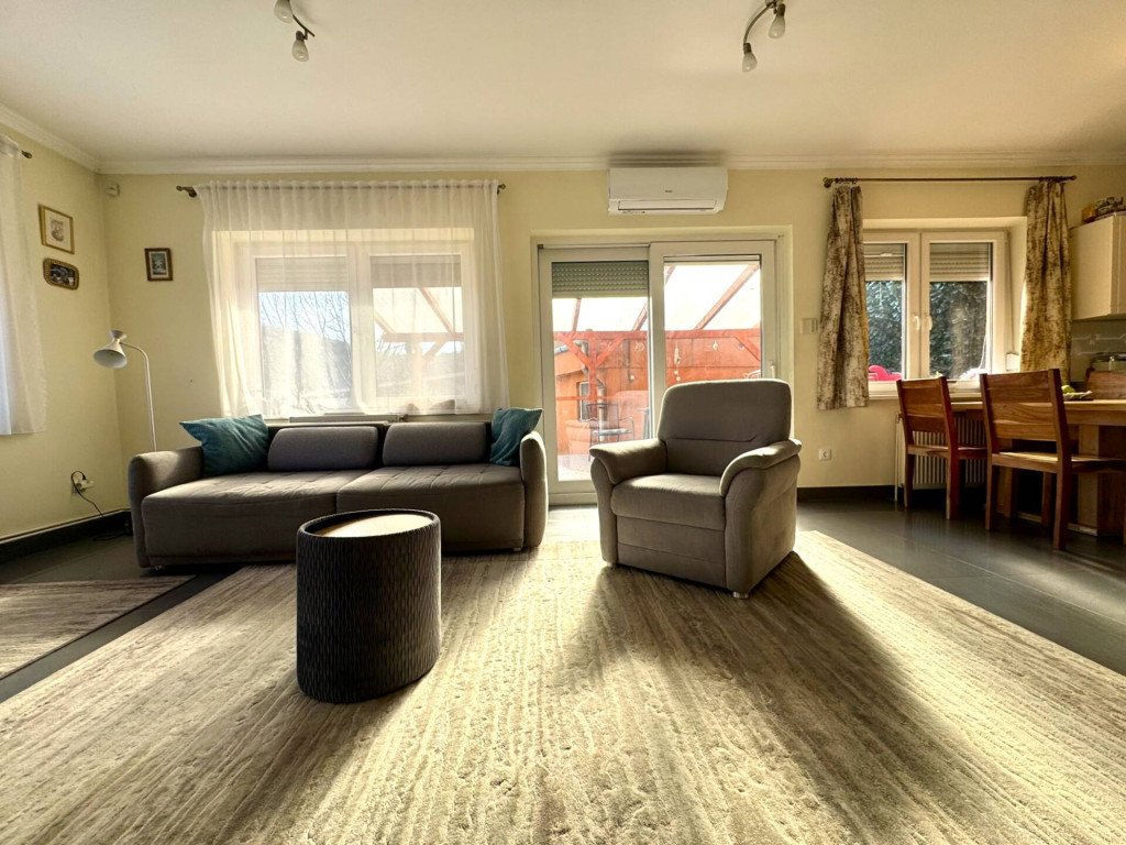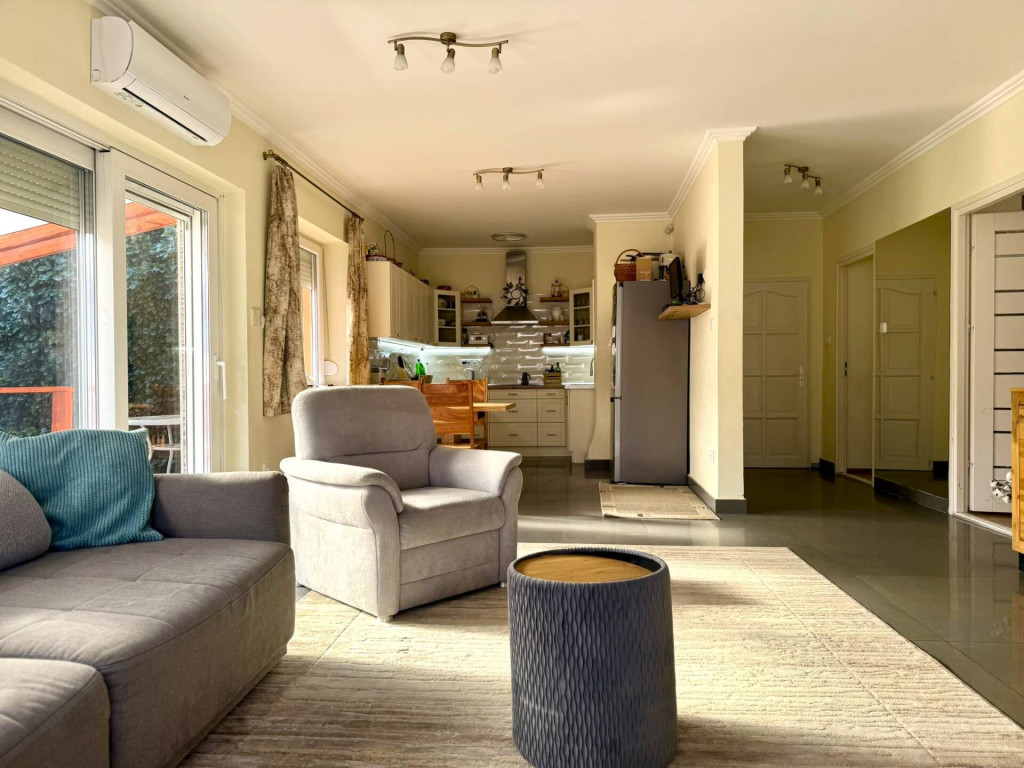 A nappaliból tolóajtón keresztül közelíthető meg egy 21 m²-es, hangulatos terasz, amely ideális helyszín a reggeli kávéhoz, egy nyugodt esti beszélgetéshez vagy a csendes kikapcsolódáshoz.