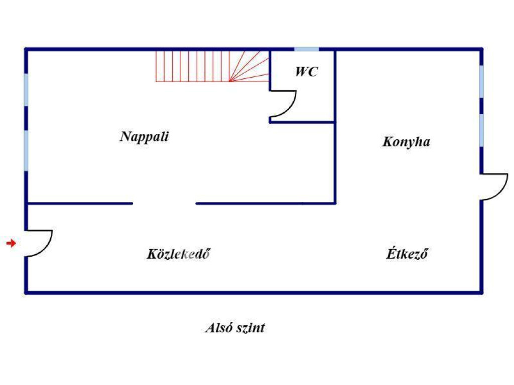 Földszint: tágas nappali, étkező, konyha, külön WC