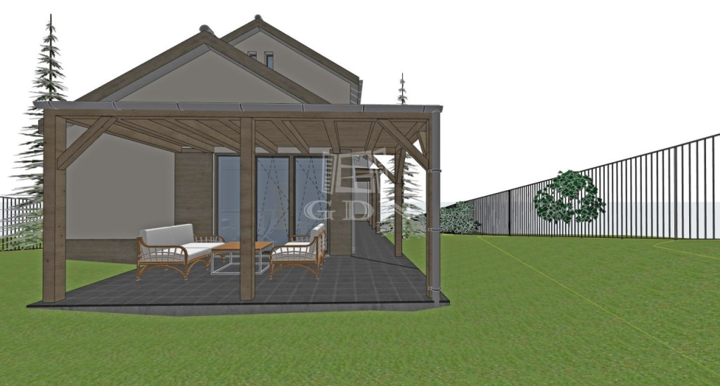 -Tető: Betoncserepes héjazat, korcolt lemezfedésű előtetőkkel