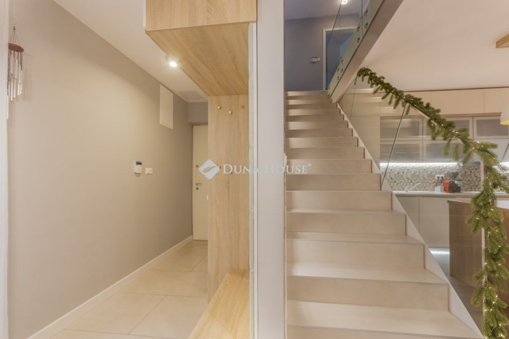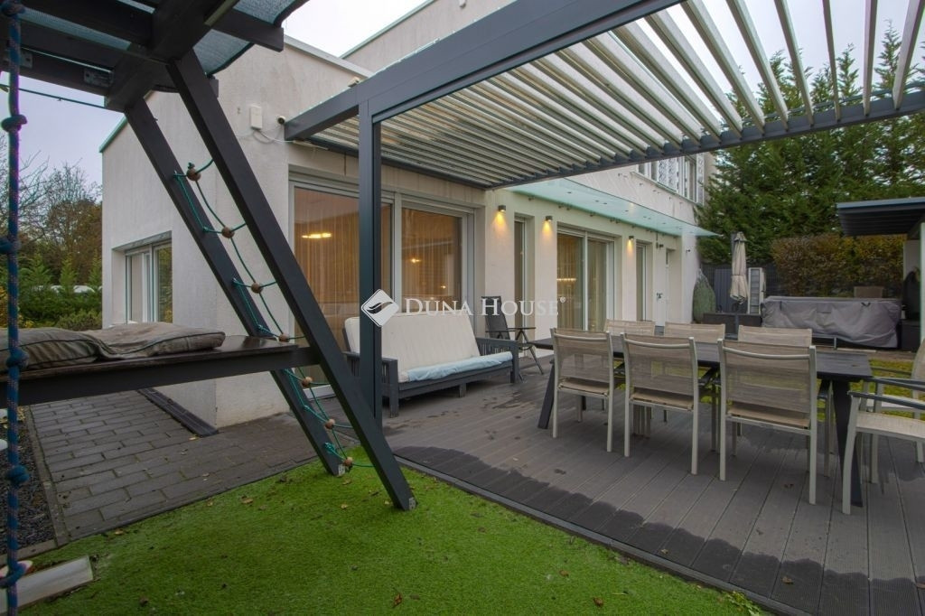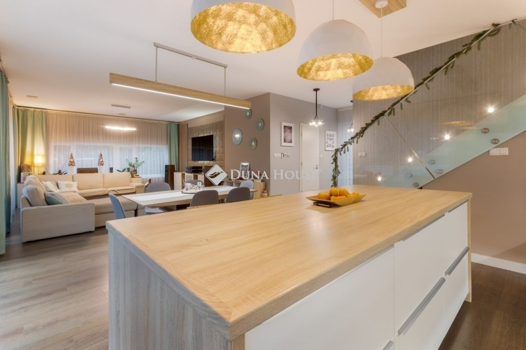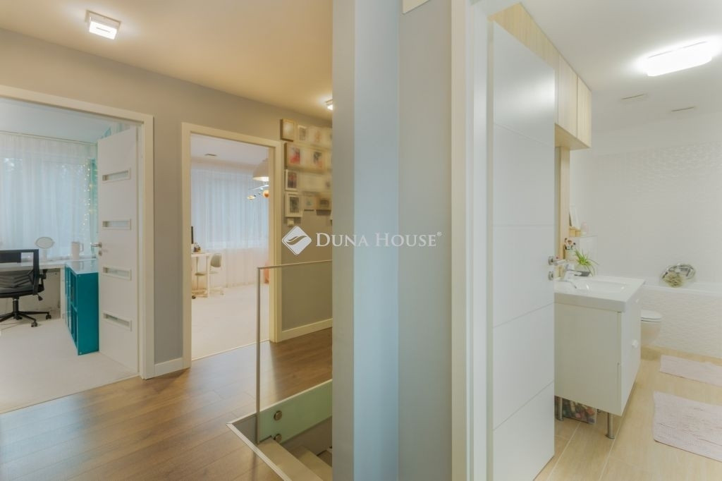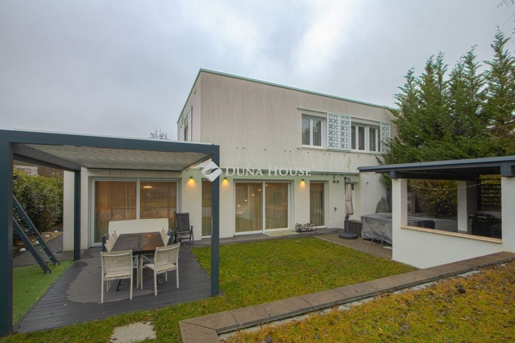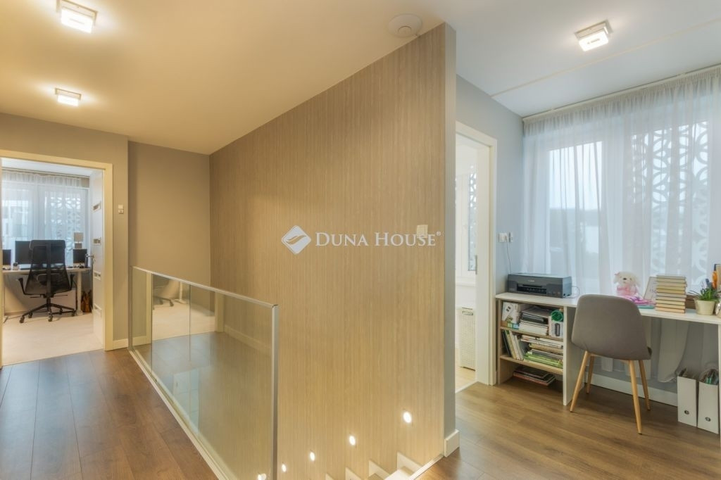 PRÉMIUM, MINIMÁL STÍLUSÚ IKERHÁZFÉL MAGAS MŰSZAKI TARTALOMMALEladásra kínálunk egy 2019-ben épült, újszerű állapotú, prémium kivitelű ikerházfelet, amely kialakításában, műszaki tartalmában és használhatóságában is a felső kategóriát képviseli.Az ingatlan 152 m² lakótérrel rendelkezik, a garázs és terasz súlyozott figyelembevételével a számított hasznos terület kb. 195 m².FŐBB PARAMÉTEREK- 152 m² lakótér, 195 m² számított terület- 38 m² fűtött, szigetelt, kétállásos garázs- 60 m² terasz, részben elektromos pergolával- 800 m² telek- Nappali + 4 hálószoba- 2 fürdőszoba- Építés éve: 2019ELRENDEZÉSA földszinten egy tágas, 52 m²-es nappaliétkezőkonyha biztosítja a családi élet központját, emellett előszoba és kiszolgáló helyiségek kaptak helyet.Az emeleten négy külön nyíló hálószoba és két fürdőszoba található, az egyik közvetlenül a szülői hálóból nyílik.MŰSZAKI TARTALOMAz épület Porotherm falazattal, monolit vasbeton födémmel, 18 cm külső hőszigeteléssel és 30 cm tetőszigeteléssel készült.A fűtésről és hűtésről hőszivattyús rendszer gondoskodik, mennyezeti és padló hőleadással, helyiségenkénti szabályozással. A melegvíz szintén hőszivattyúról működik. A házban központi hővisszanyerős szellőztető rendszer üzemel.A nyílászárók háromrétegű üvegezésűek, elektromos alumínium redőnnyel és szúnyoghálóval felszerelve.KÉNYELEM ÉS BIZTONSÁG- Okosotthon-rendszer- Elektromos redőnyök- Riasztó- és kamerarendszer- Kiépített, stabil wifi-hálózat- Minőségi burkolatok, szaniterek- Gépesített konyha a vételár részeKERT ÉS KÜLSŐ TEREKA kert automata öntözőrendszerrel ellátott, külön locsolásmérővel. A terasz ideális pihenésre és vendégfogadásra, az elektromos pergola révén árnyékolása rugalmasan szabályozható. A kert hátsó részén fedett kerti pavilion található, amely grillezésre is alkalmas.Megtekintés: előre egyeztetett időpontban, rugalmasan. Hívjon még ma, nehogy lemaradjon erről is!