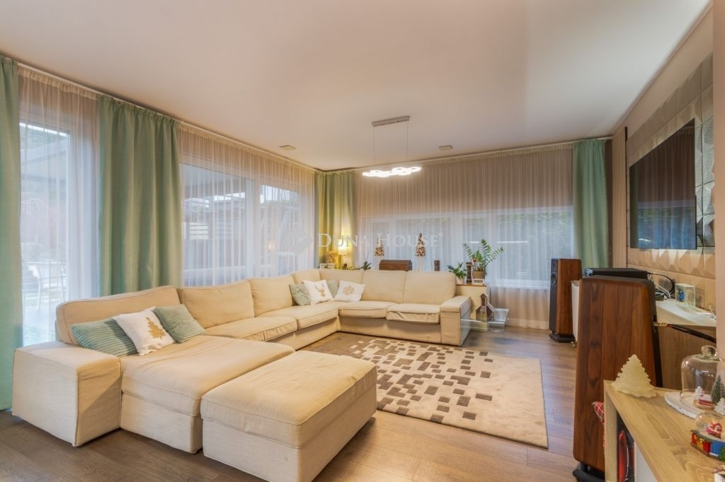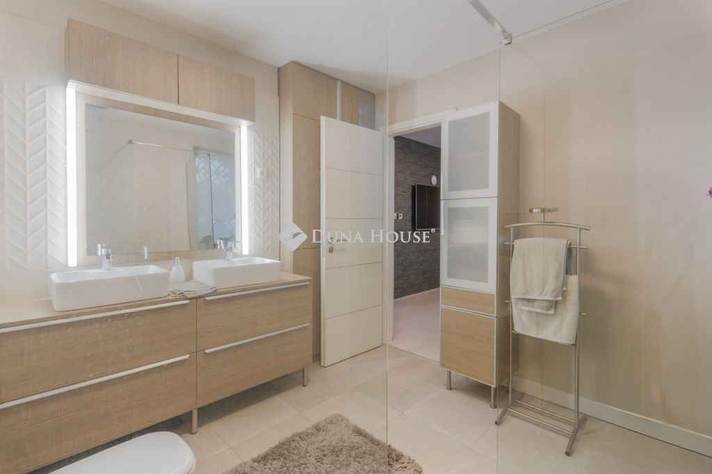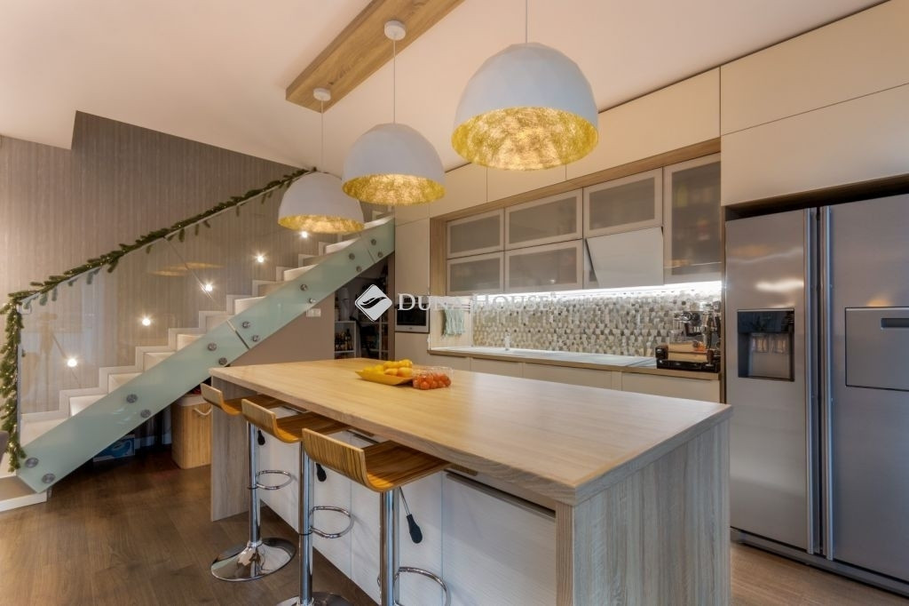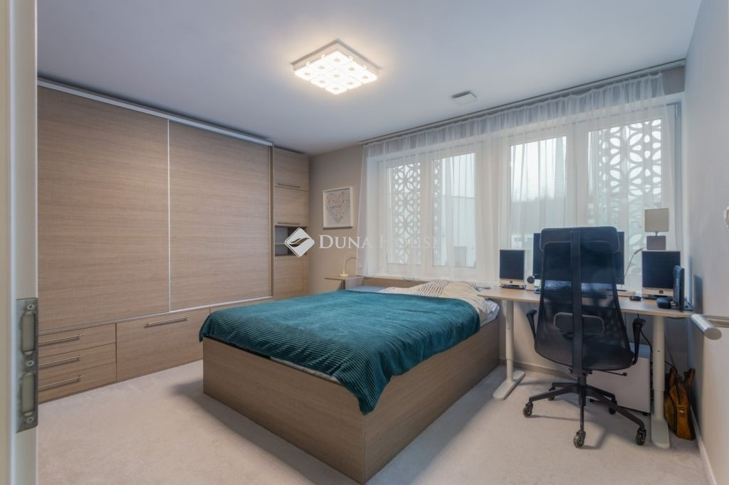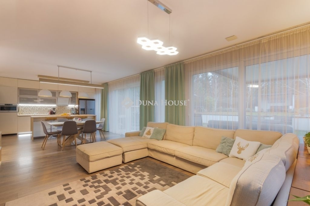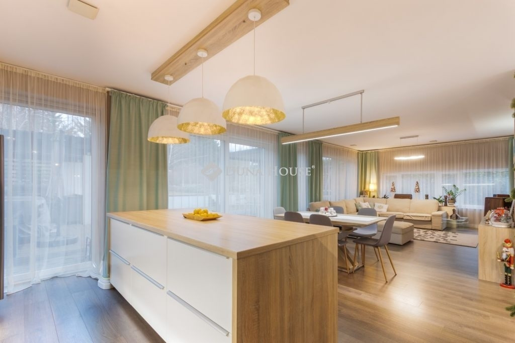 PRÉMIUM, MINIMÁL STÍLUSÚ IKERHÁZFÉL MAGAS MŰSZAKI TARTALOMMALEladásra kínálunk egy 2019-ben épült, újszerű állapotú, prémium kivitelű ikerházfelet, amely kialakításában, műszaki tartalmában és használhatóságában is a felső kategóriát képviseli.Az ingatlan 152 m² lakótérrel rendelkezik, a garázs és terasz súlyozott figyelembevételével a számított hasznos terület kb. 195 m².FŐBB PARAMÉTEREK- 152 m² lakótér, 195 m² számított terület- 38 m² fűtött, szigetelt, kétállásos garázs- 60 m² terasz, részben elektromos pergolával- 800 m² telek- Nappali + 4 hálószoba- 2 fürdőszoba- Építés éve: 2019ELRENDEZÉSA földszinten egy tágas, 52 m²-es nappaliétkezőkonyha biztosítja a családi élet központját, emellett előszoba és kiszolgáló helyiségek kaptak helyet.Az emeleten négy külön nyíló hálószoba és két fürdőszoba található, az egyik közvetlenül a szülői hálóból nyílik.MŰSZAKI TARTALOMAz épület Porotherm falazattal, monolit vasbeton födémmel, 18 cm külső hőszigeteléssel és 30 cm tetőszigeteléssel készült.A fűtésről és hűtésről hőszivattyús rendszer gondoskodik, mennyezeti és padló hőleadással, helyiségenkénti szabályozással. A melegvíz szintén hőszivattyúról működik. A házban központi hővisszanyerős szellőztető rendszer üzemel.A nyílászárók háromrétegű üvegezésűek, elektromos alumínium redőnnyel és szúnyoghálóval felszerelve.KÉNYELEM ÉS BIZTONSÁG- Okosotthon-rendszer- Elektromos redőnyök- Riasztó- és kamerarendszer- Kiépített, stabil wifi-hálózat- Minőségi burkolatok, szaniterek- Gépesített konyha a vételár részeKERT ÉS KÜLSŐ TEREKA kert automata öntözőrendszerrel ellátott, külön locsolásmérővel. A terasz ideális pihenésre és vendégfogadásra, az elektromos pergola révén árnyékolása rugalmasan szabályozható. A kert hátsó részén fedett kerti pavilion található, amely grillezésre is alkalmas.Megtekintés: előre egyeztetett időpontban, rugalmasan. Hívjon még ma, nehogy lemaradjon erről is!
