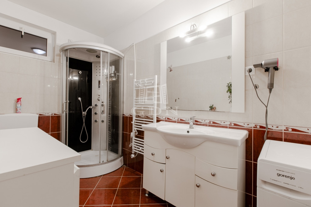 Az épület 2006-ban épült beton alapra tégla falazattal, beton födémmel, szomszéd felé dupla falazattal, és betoncserép fedéssel. A falazat körbe 8 cm dryvit szigetelést, thermo műanyag nyílászárót (redőnnyel és rovarhálóval), kondenzációs gázkazánt, és helységenként inverteres hűtő-fűtő klímát kapott. Nappaliban elhelyezésre került egy kandalló, a lakás biztonságáért pedig távfelügyeletes riasztó felel. A minimális költségekért pedig felhelyeztek 7 kw napelem rendszert ami Szaldó elszámolással rendelkezik. Udvara környezete tiszta rendezett, egy autó számára fűtött garázs áll rendelkezésünkre, két autónak pedig felszíni beálló. Az udvar szépségéért automata öntözőrendszer felel. Hátul található egy kellemes hangulatot árasztó 18 nm-es fedett terasz, mellette pedig egy 8 nm-es szerszám tároló található.