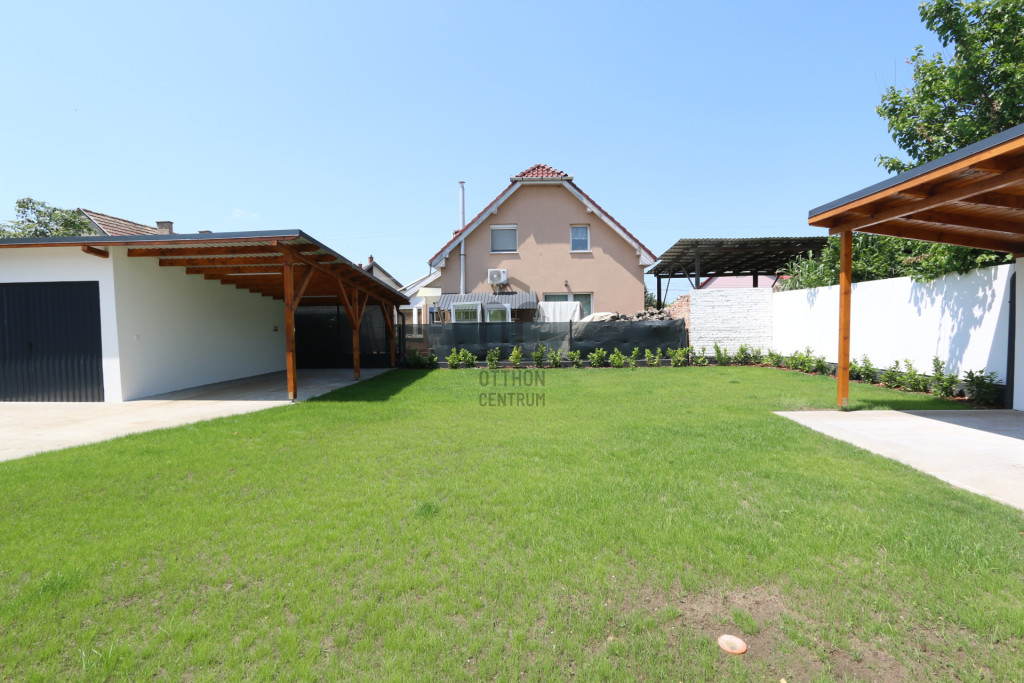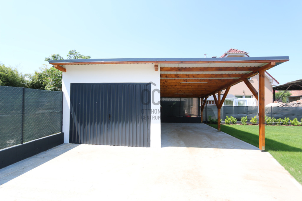 Tartozik hozzá egy önálló garázs és egy fedett kocsibeálló.