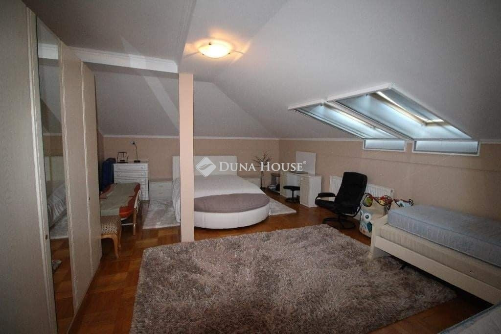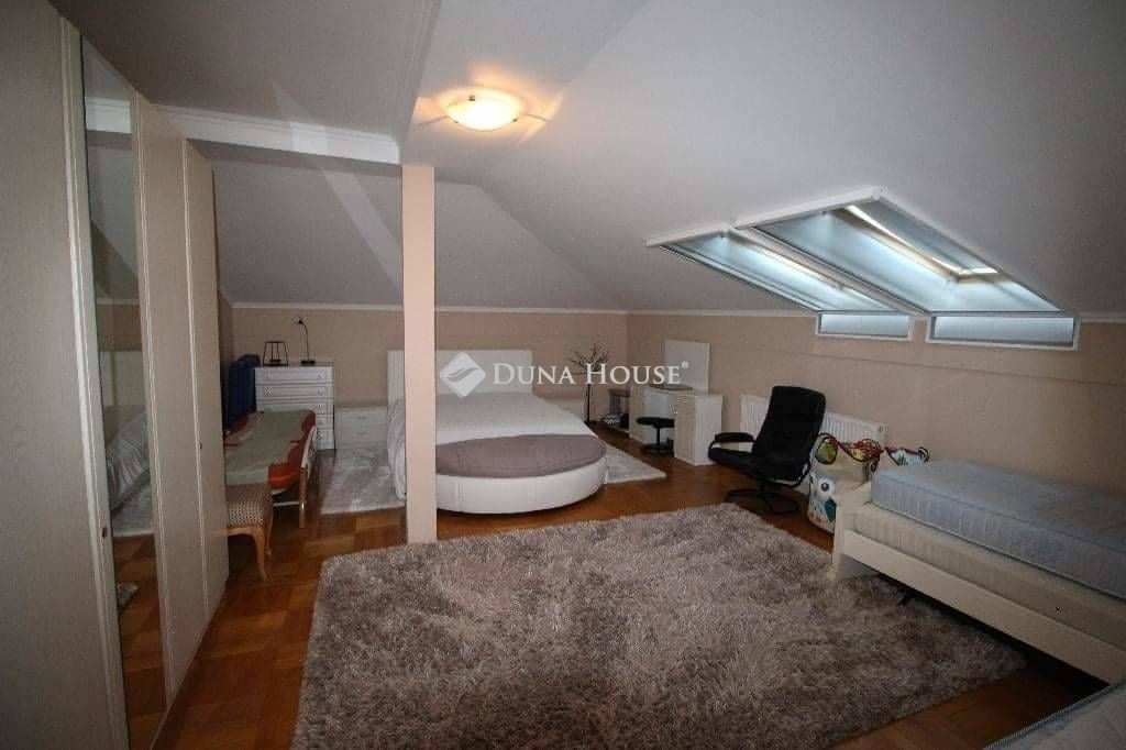 A felső szintre egy gyönyörű, kovácsoltvas korláttal ellátott, kényelmes lépcsőn juthatunk fel, amely már önmagában is lenyűgöző látványt nyújt. Itt található két hatalmas szoba, egy további nappali és egy fürdőszoba WC-vel, melyek még inkább kiemelik az ingatlan kényelmi funkcióit. A felső szint legeredetibb része egy hatalmas, fedett erkély, mely valóban lenyűgöző panorámával kápráztatja el az ide látogatókat.