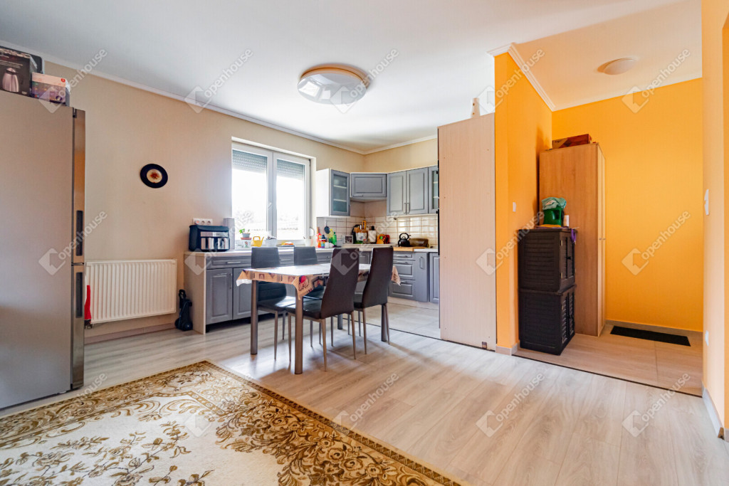 A ház belső tere minden igényt kielégít: a tágas amerikai konyhás nappali a központi élettér, ahol a család és a barátok kényelmesen együtt lehetnek. A nappali mellett három külön nyíló hálószoba biztosítja a privát szférát – ideális nagyobb családnak, otthoni irodának vagy vendégszobának is.