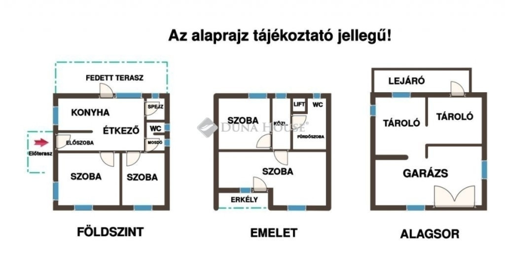 3 szintből áll a ház: alagsor, földszint és emelet.