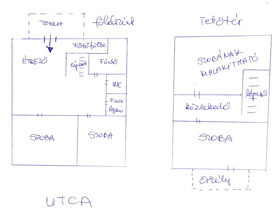 Az ingatlan lakóterülete kb. 120 m2, melyben a földszinten konyha-étkező, közlekedő, 2 szoba, fürdőszoba és WC, míg a tetőtérben 2 szoba található.