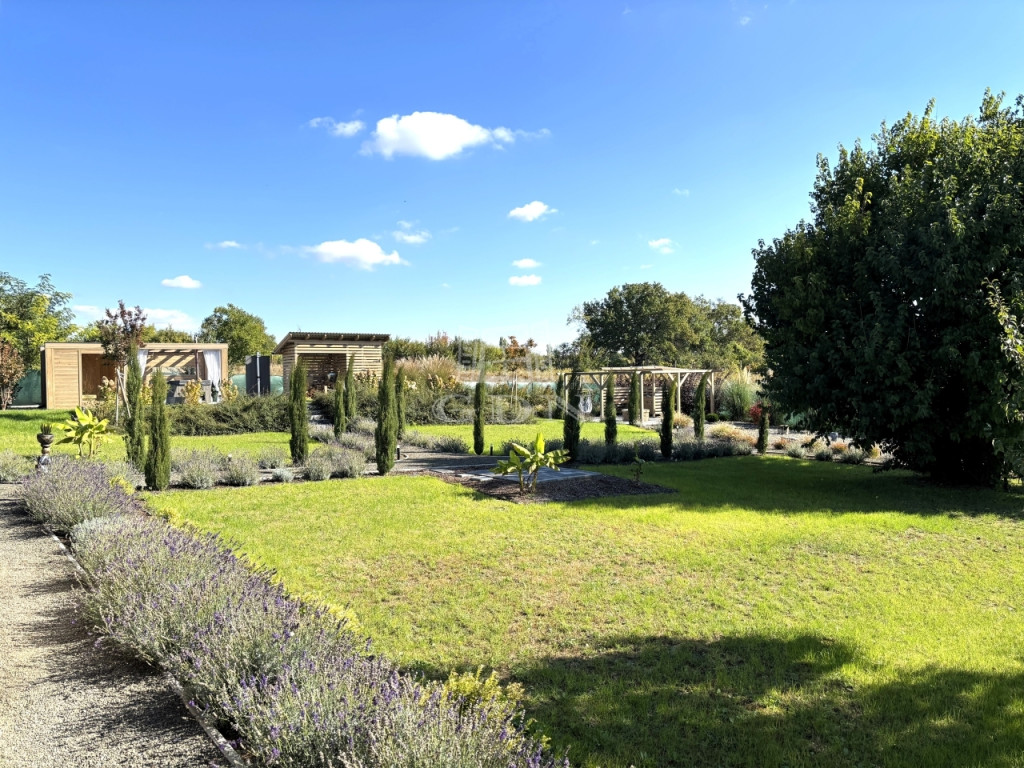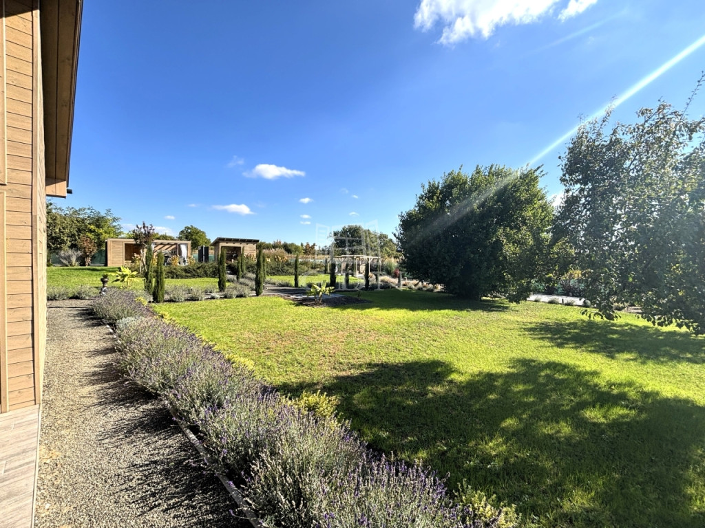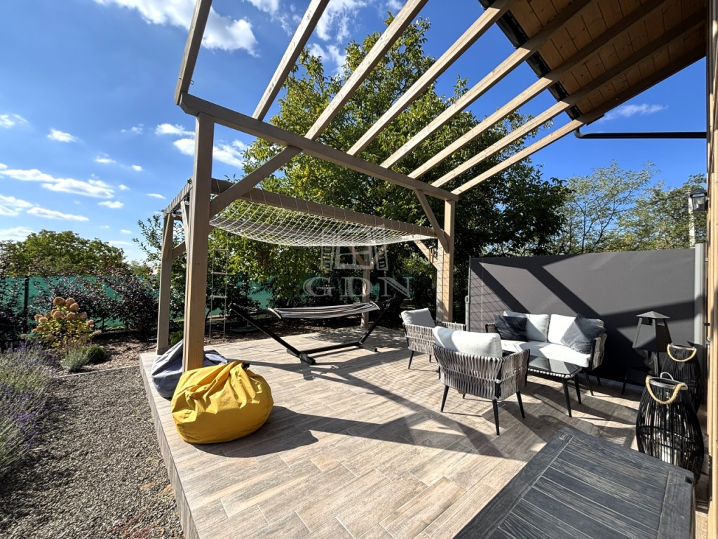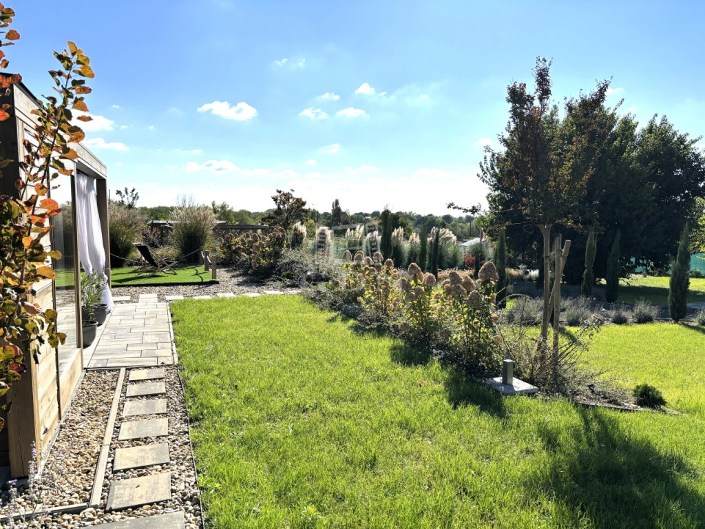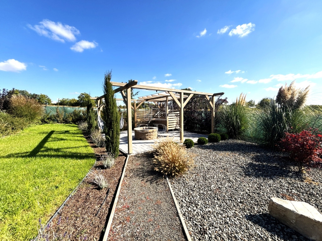 - A KÖRBÉKERÍTETT, füvesített kert dísznövényekkel és KERTI SÜTÖGETŐVEL, került kialakításra.