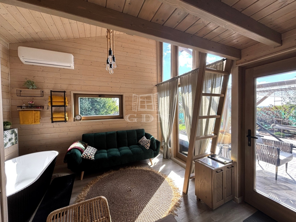 Eladó Monor csendes részén, 2136 m²-es nyugodt, gyönyörűen PARKOSÍTOTT telken ahol a belső béke és a természet harmóniája találkozik, egy 28 m²-es galériás modern faház SZIGETELÉSSEL és thermo üvegezéssel.
