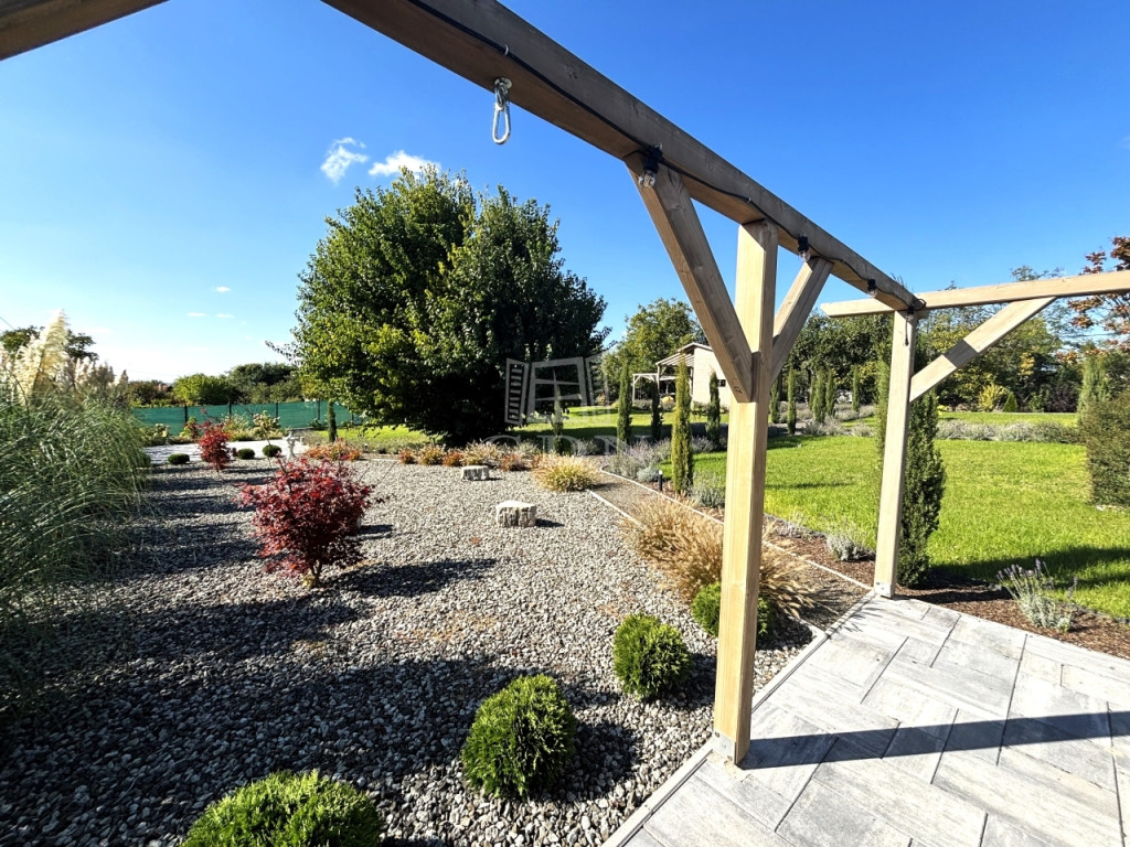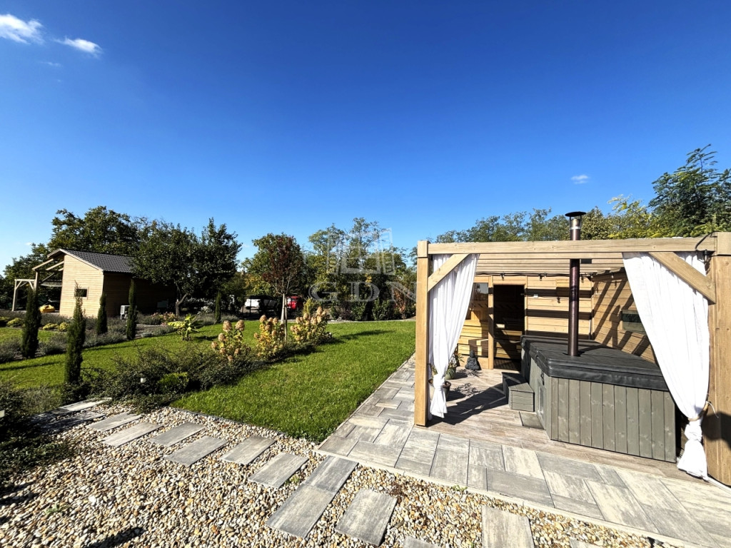 - KÜLÖNÁLLÓ WELLNESS ÉPÜLET szaunával, dézsával, kinti zuhanyzóval, FEDDETT PIHENŐRÉSSZEL és hangulatos esti világítással.