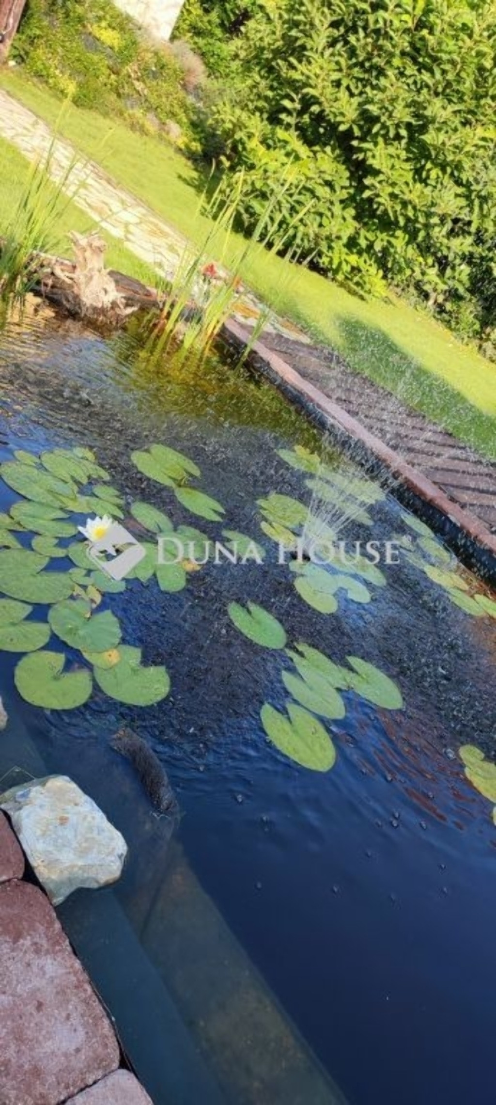 Előkertben halastó és 3 autó számára kocsibeálló automata öntözéssel kialakított zöldövezeten keresztül léphetünk be a telekre.
