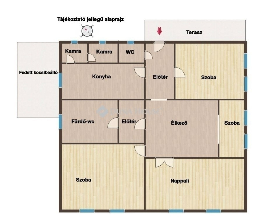 A fedett terasz akár jó időben külön helyiségként is használható, gépjárművét a fedett beálló óvja az időjárás viszontagságaitól.