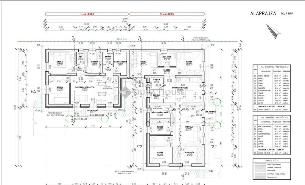 B 30-as téglából. cserép fedéssel, beton alapon, műanyag nyílászárókkal.Burkolatok 5000 ft/m2 értékben választható.