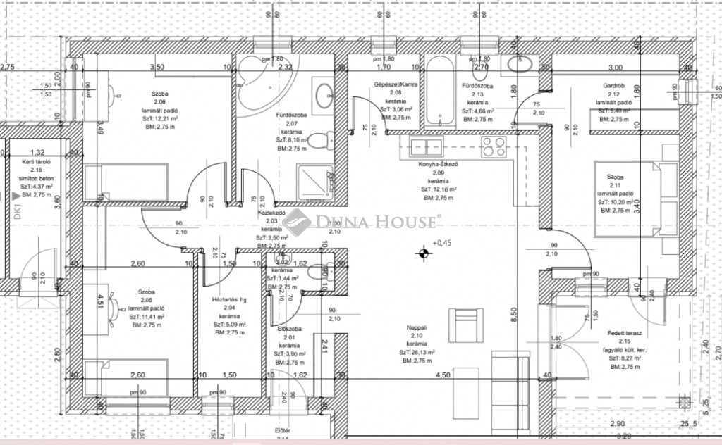 fedett terasz: 13,05 m²
