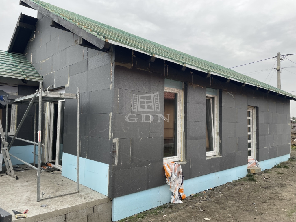 • Homlokzati szigetelés: 10 cm grafit EPS homlokzati hőszigetelő lemez (pl. Austroherm Grafit), padozat alatt 12 cm vtg hőszigetelés (pl. Austrotherm AT-N-100