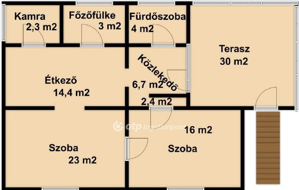 Helyiségei: 2 külön-nyíló szoba, konyha, étkező, kamra, fürdőszoba és közlekedő.