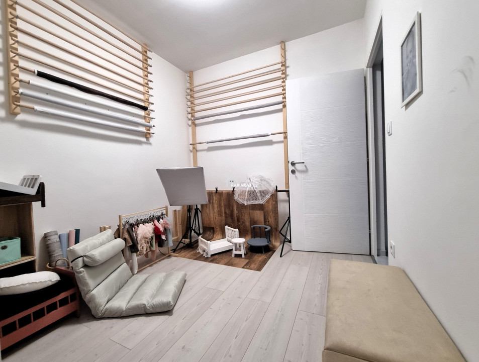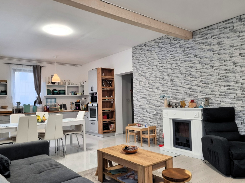 A FŐ EGYSZINTES LAKÓHÁZ HELYISÉGEI ( 110 m2-en): folyosó, tágas amerikai konyha/étkező/nappali (41 m2-en radiátoros hőleadással) 2 szoba (12 m2 + 12 m2 padlófűtéssel) félszoba mely jelenleg egy fotós helyiség (radiátoros fűtéssel) gardrób helyiség, zuhanyzós fürdőszoba egy helyiségben a wc-vel + dupla mosdóval.