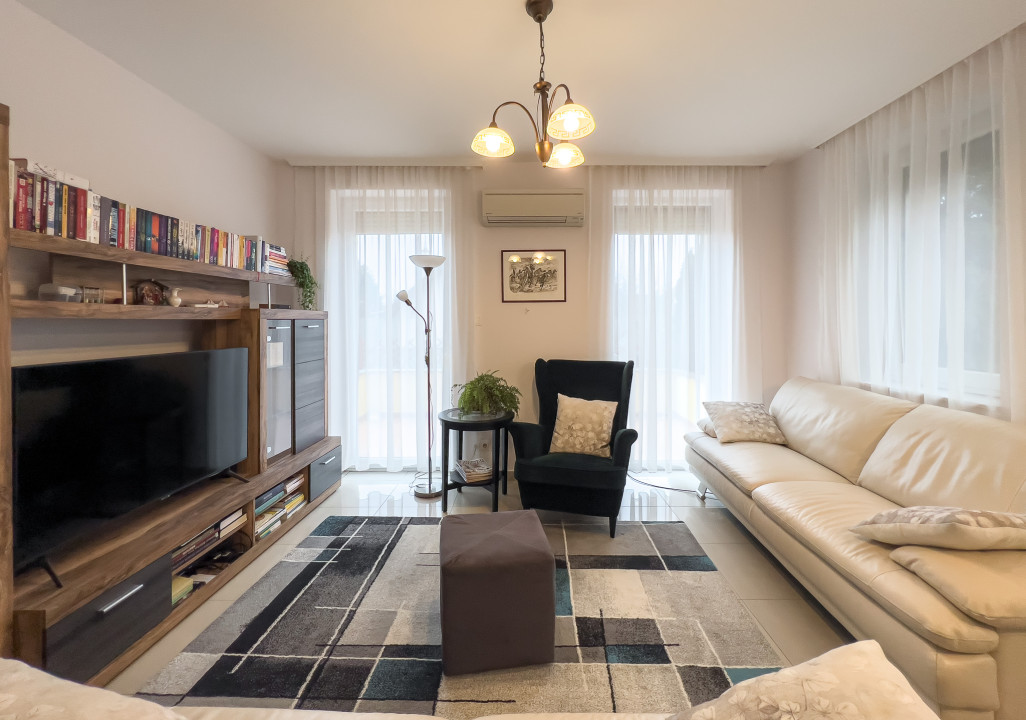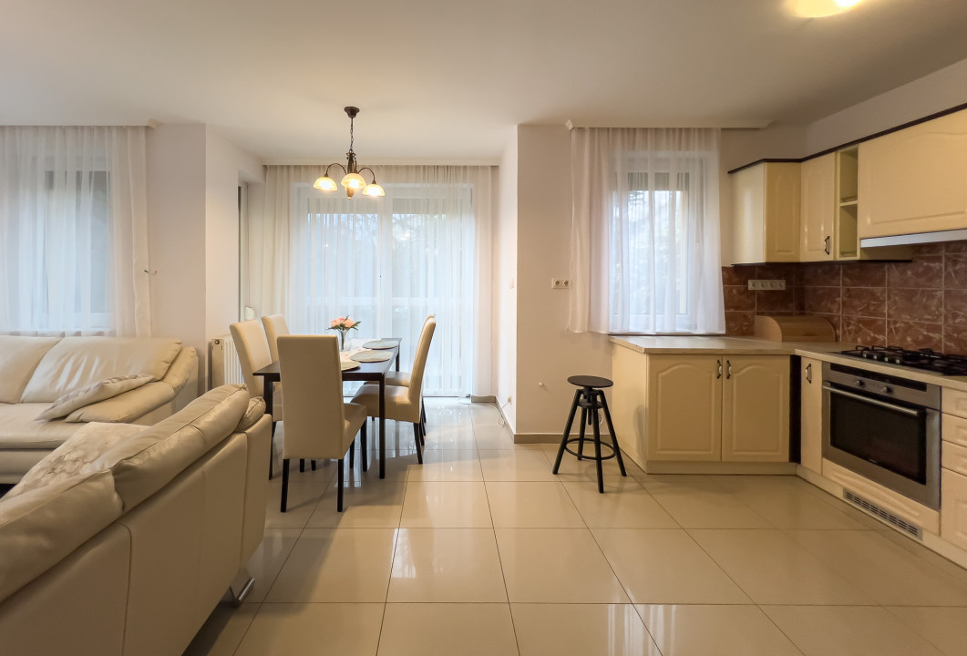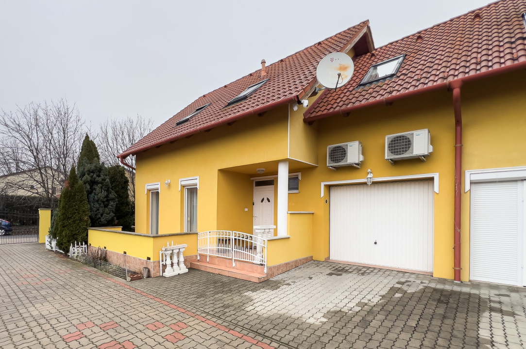 Az ikerház rendkívül pozitív kisugárzású, szépen lakott családi otthon. A helyiségek felosztása is optimálisan lett kialakítva. A földszinti részen 3 nm-es belepő, amerikai konyha , étkező, nappali, konyha, háztartási helyiség, vendég wc, zuhanyzós fürdőszoba található. A 16 nm-es garázsból közvetlenül bejuthatunk a földszinti helyiségekbe. A nappaliból nyílik egy 13 nm-es terasz.