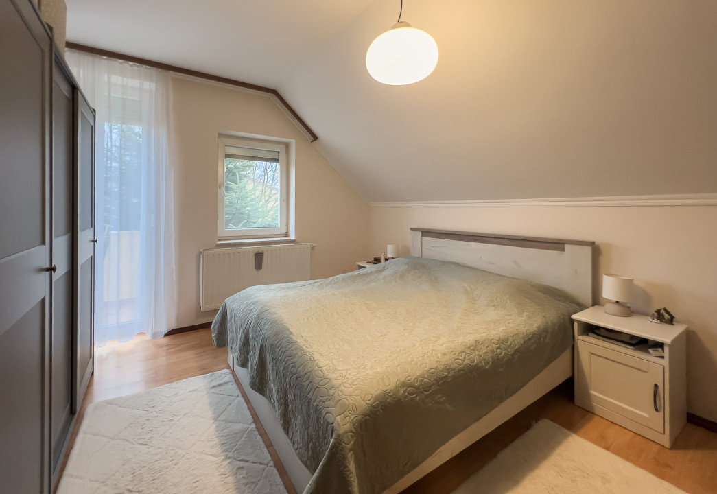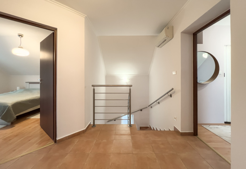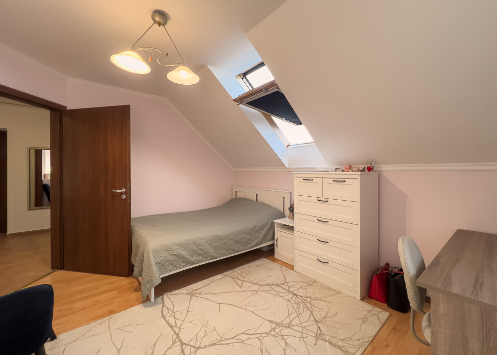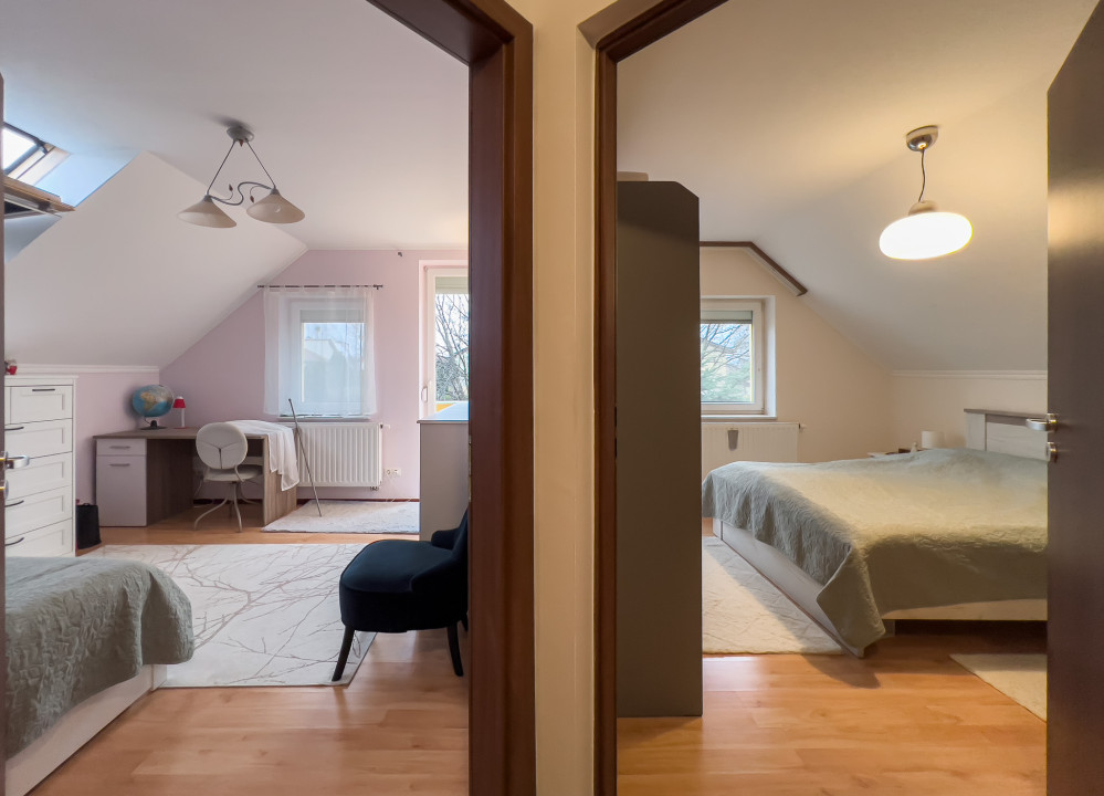 Az emeleti részen 2 db utcafront felé nyíló hálószoba épült, mindkét szobából nyitható 5 nm-es közös erkéllyel. Egy harmadik hálószoba gardróbbal és kádas fürdőszoba is megtalálható még az emeleten .